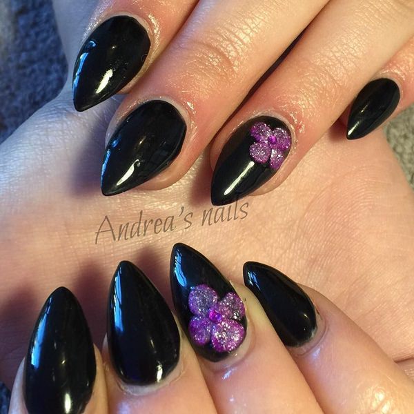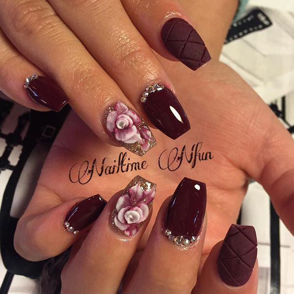 This violet matte finish is a lovely design, complete with matching gems and white petals that can match a variety of outfits.