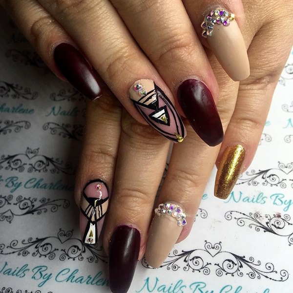 We like the variety of shades used here – from light pink, to beige, to gold and black – with glittering gems and a lovely geometric design to set the look.