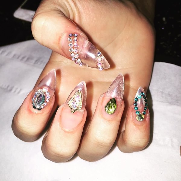 The large stones used here match the shape of the nails; an arching theme that causes your fingers to look longer and slimmer.
