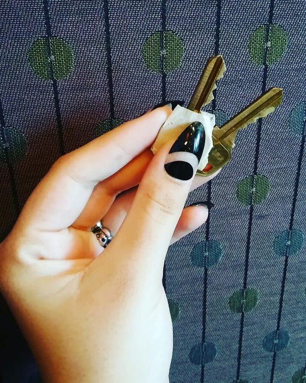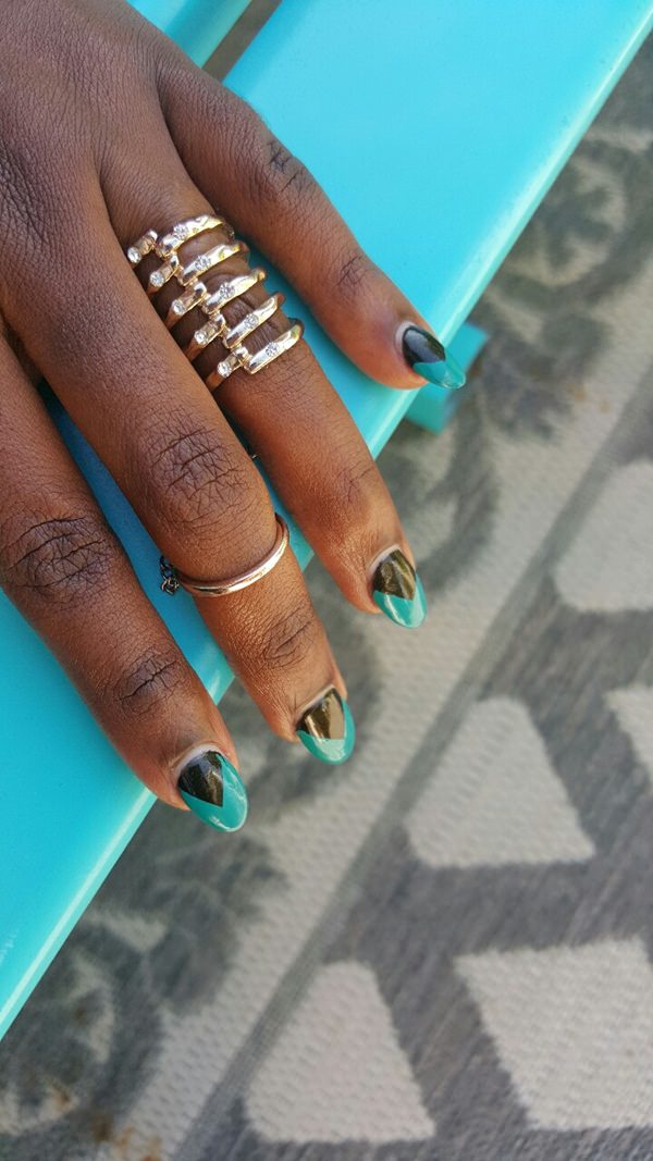 Classic black can always be spruced up with a few added twists in the mix. See the nail piercing on the pinkie? Totally awesome, just don’t get it caught on anything.