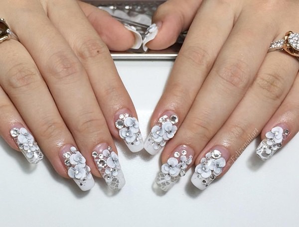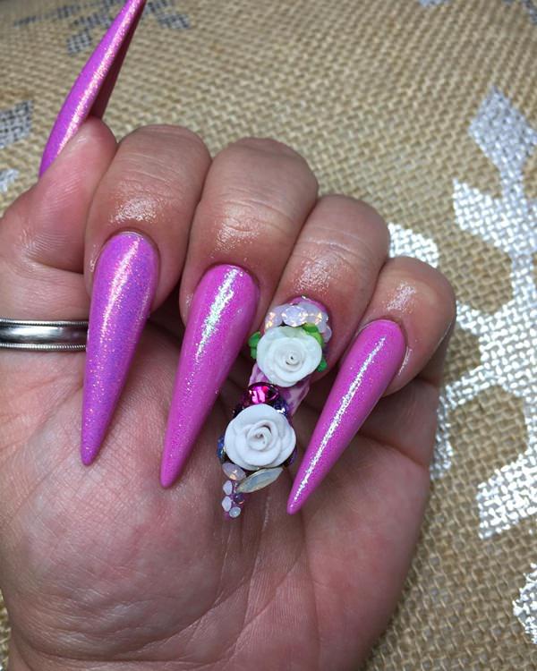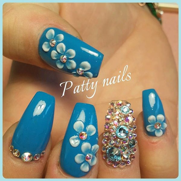 Only the bold may try this design! If you aren’t afraid of attempting to use your touchphone screen while sporting these bad babies, then by all means, give them a chance in your beauty regime! You can add tons of detail to length nails like these, just take a look at all those flowers and gems on the ring finger!