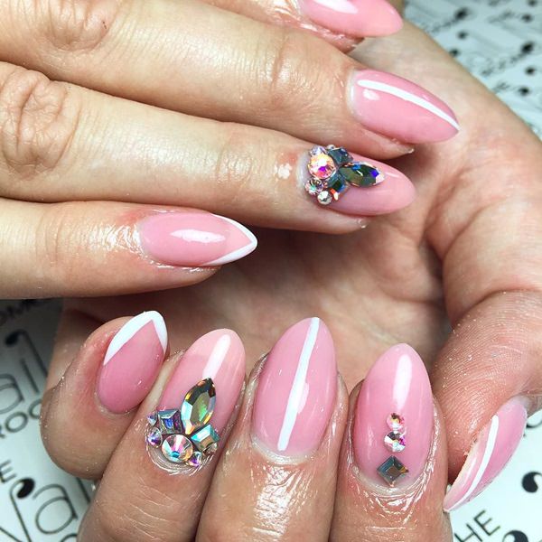 Classic pink nails given a touch of personality with gems and white, unique stripes.