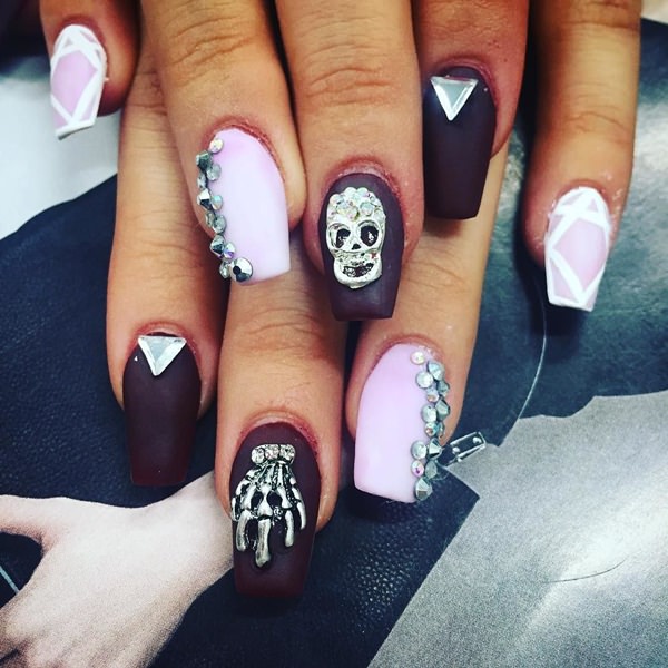 This killer design uses nail art you’ll have to find at your local salon or ask your nail artist to supply. Perfect for going to a concert and sporting the “rock on” hand sign: .m/