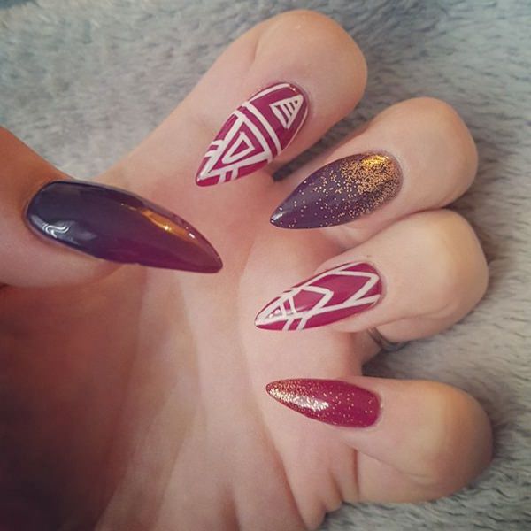 This design sports long stilettos with intriguing designs similar to tribal. The glitter adds sparkling dimension.