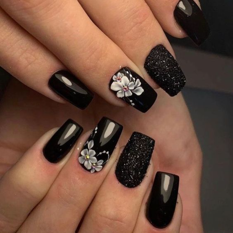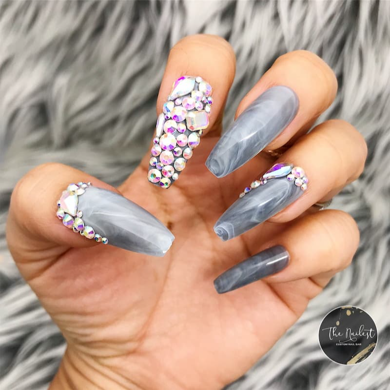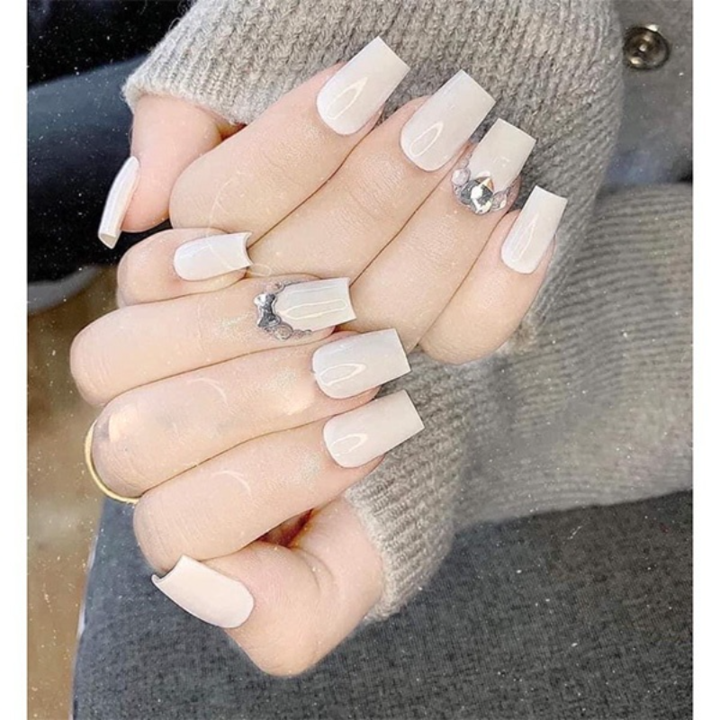 Adorn your stark white nails with rhinestones and gems, positioning them either at the base or tip for that extra glam touch.