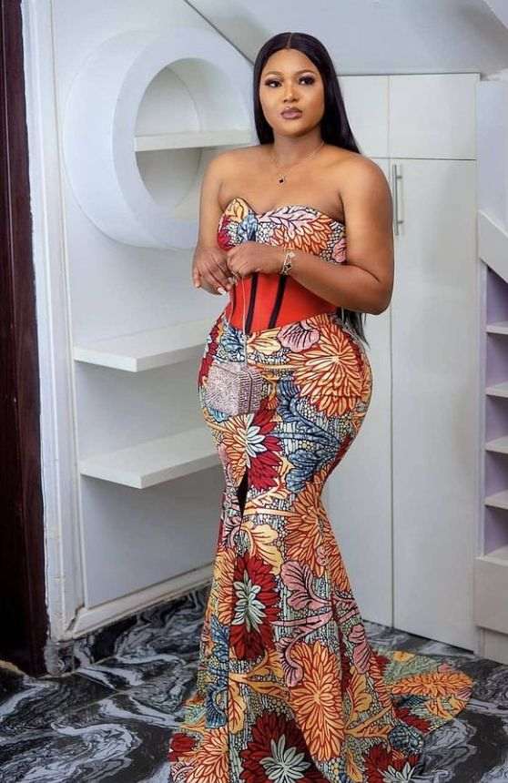 Embrace your inner goddess with a stunning Ankara mermaid gown. The fitted silhouette hugs your curves in all the right places, while the flared bottom creates a dramatic and feminine appeal. The vibrant Ankara print adds a touch of African heritage, making it a perfect choice for formal events or special occasions.