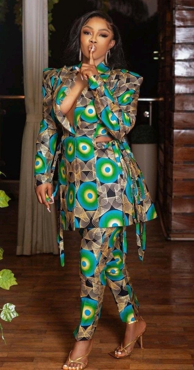 A tunic paired with trousers is a casual yet chic Ankara two-piece style. It’s perfect for a relaxed day where comfort is key but style is still a priority.