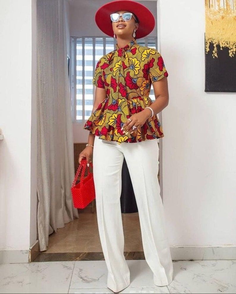 - Elegant Blouses: For a sophisticated look, pair your Ankara skirt with a sleek blouse. Think along the lines of silk, satin, or chiffon tops with subtle embellishments or unique necklines. This combination works well for formal events or a stylish day at the office.