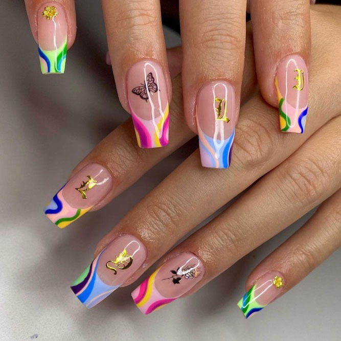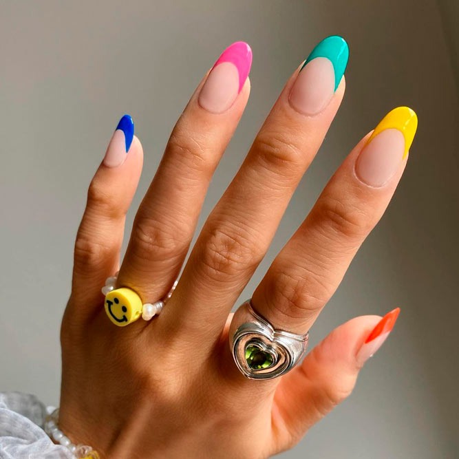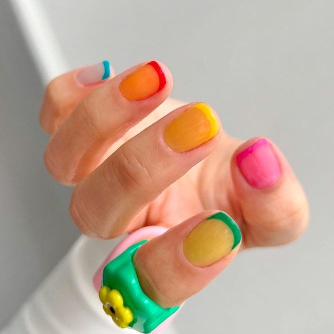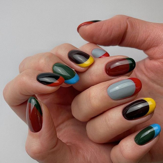 Did you know that even a French manicure can be fun and creative? If not, you have come to the right place. Check out these colorful French tip nails that feature a mix of designs. While every nail is individual, together they make up a fantastic combo. You may incorporate outlined French, a half moon mani, double French and a classic white tip in one manicure style. The most high quality nail polishes for your manicure design can be found in OPI nail polish, Zoya and Orly.