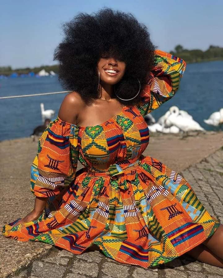 Make a statement with Ankara off-shoulder dresses that showcase your shoulders and collarbone while highlighting the fabric’s vibrant patterns.