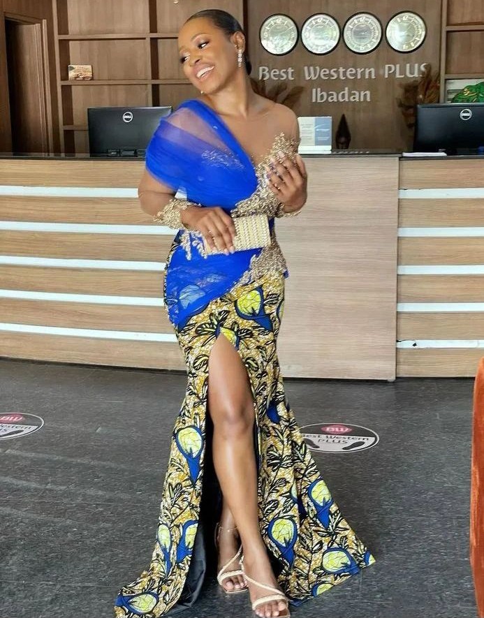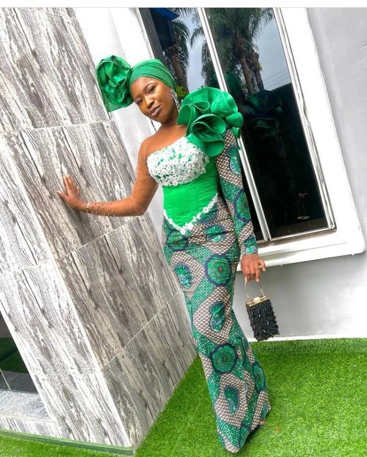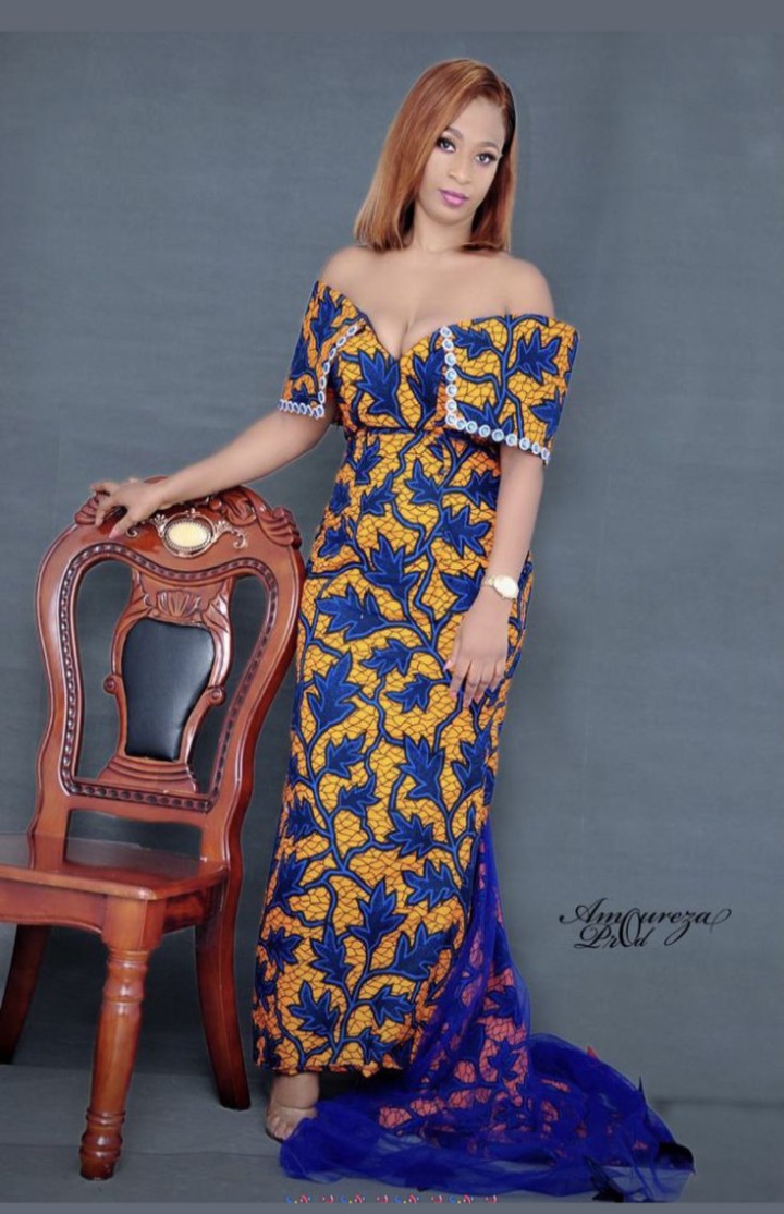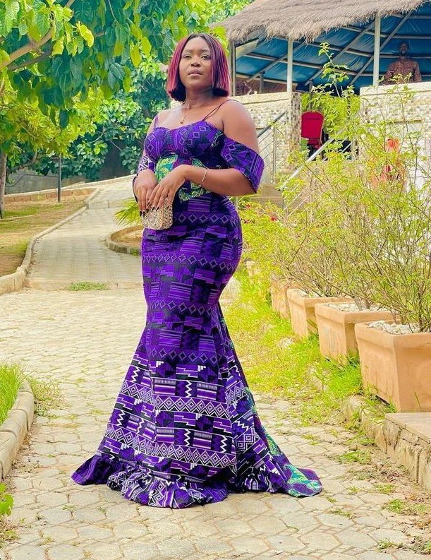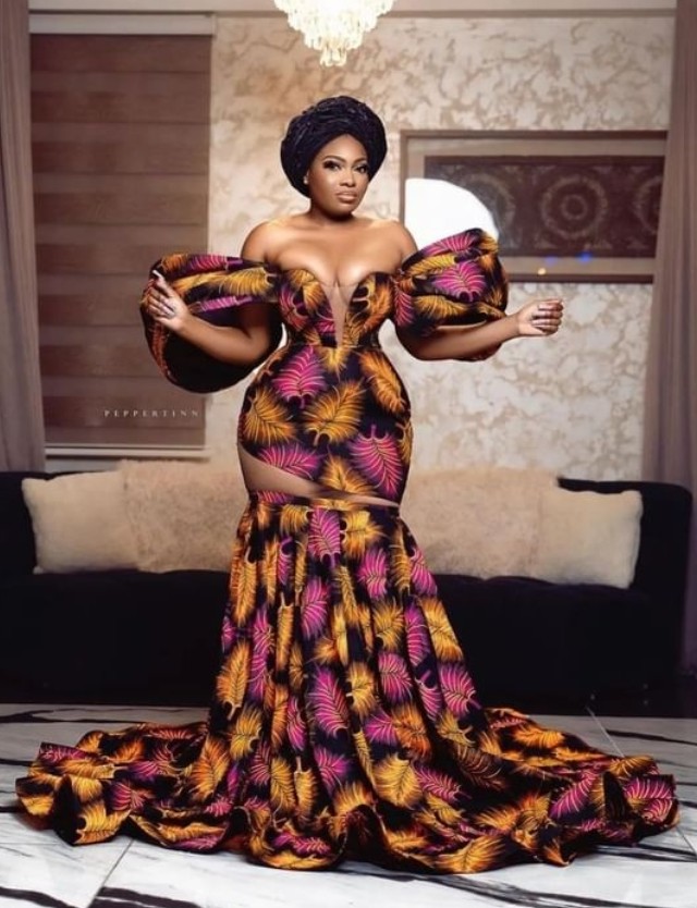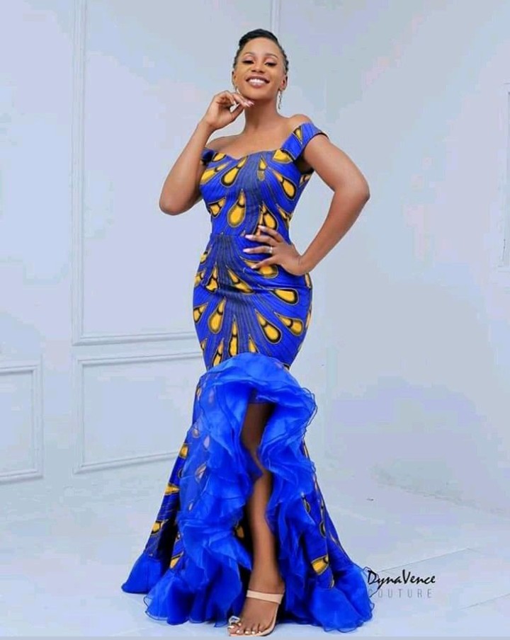 12. Ankara Off-Shoulder Gown: Opt for an off-shoulder Ankara gown with a slit for a sophisticated and glamorous look.