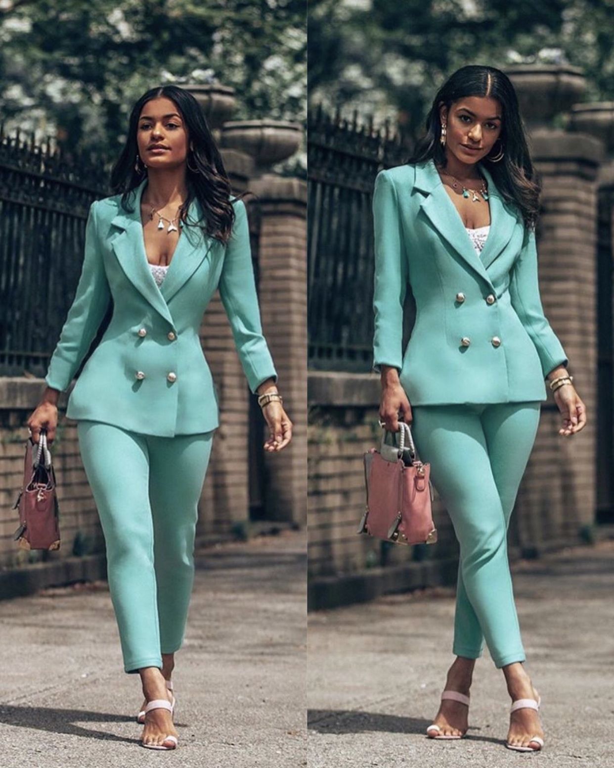 Create an effortlessly chic look with a monochrome ensemble. Select trousers/pants and a blouse in the same color family but with different shades or textures. For example, pair navy blue trousers with a lighter blue silk blouse. This creates a sophisticated and cohesive look that exudes confidence.