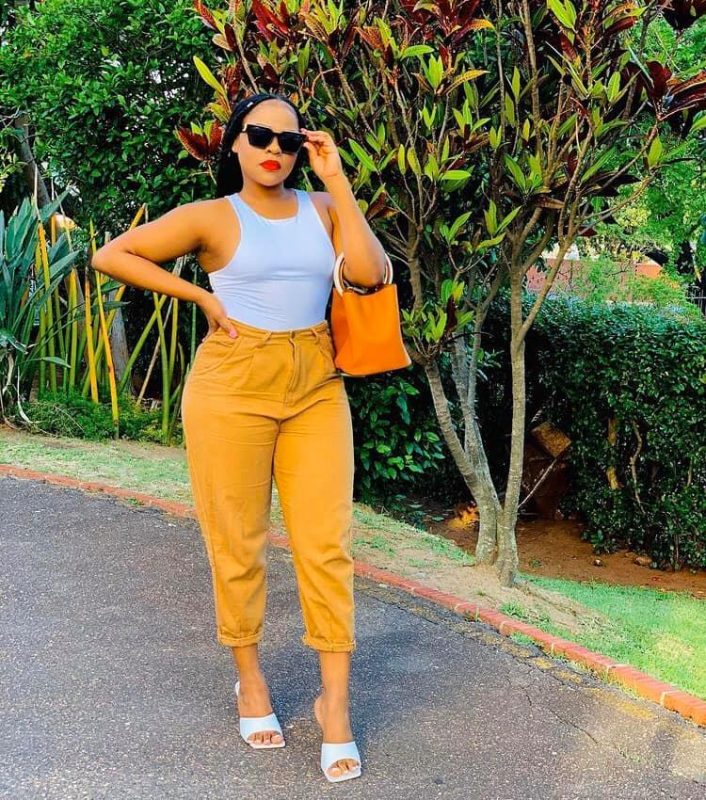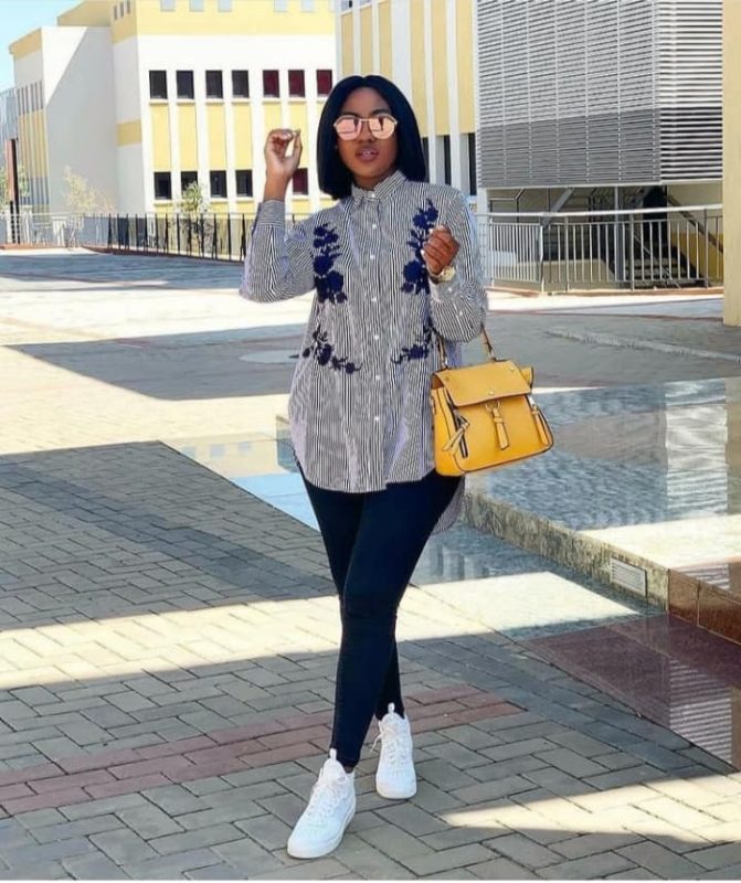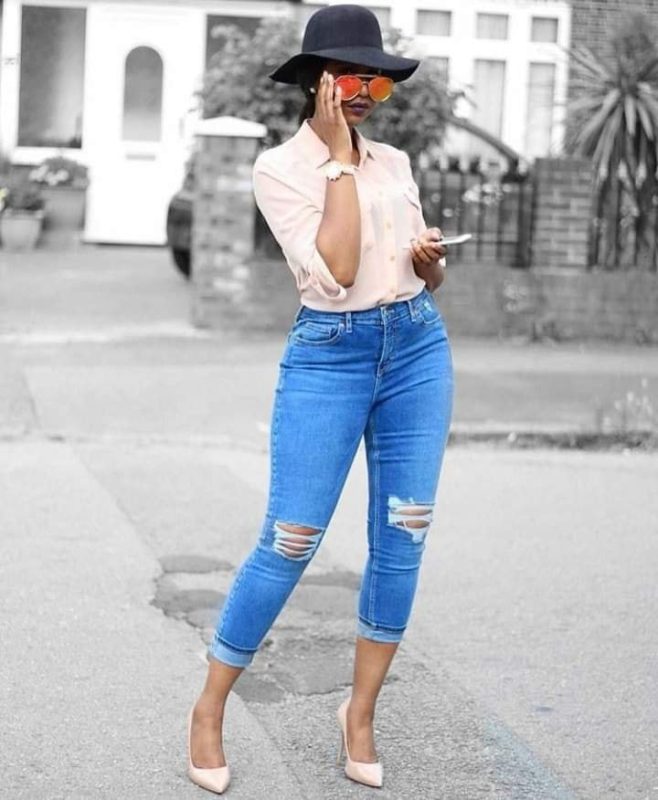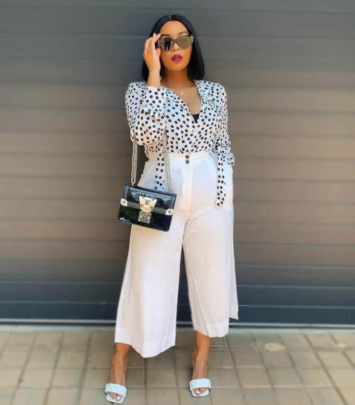For a polished and sophisticated ensemble, opt for tailored trousers paired with a blouse. Choose trousers in a classic cut and a neutral color like black, navy, or gray. Pair them with a feminine blouse in a complementary shade or a subtle pattern. Tuck the blouse into the trousers for a streamlined look. Add some sleek accessories such as a statement belt and pointed-toe pumps to elevate the outfit to the next level of sophistication.