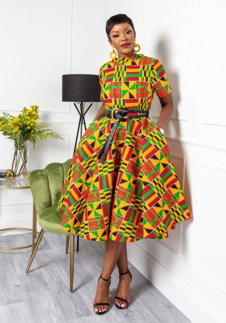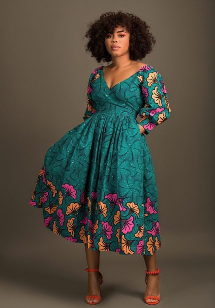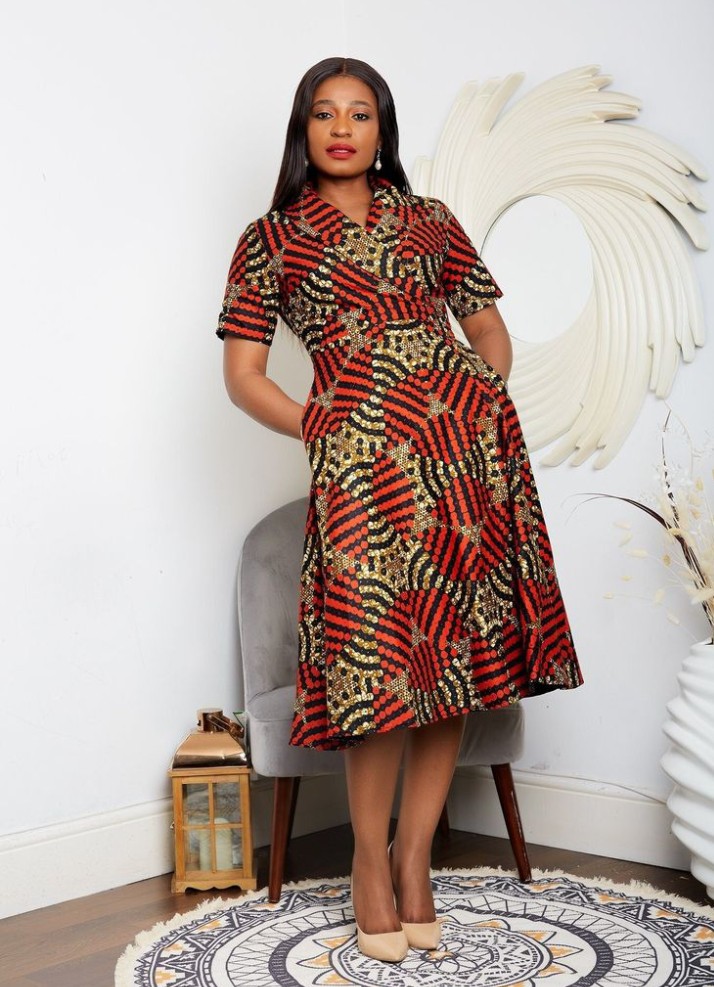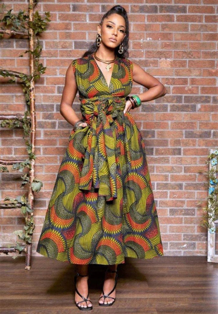 6. Ankara Midi Wrap Dress with Belt: Opt for versatility with an Ankara midi wrap dress cinched at the waist with a belt, offering a flattering and chic silhouette.