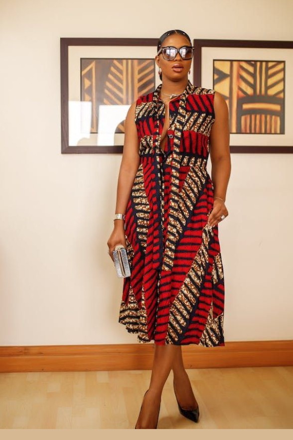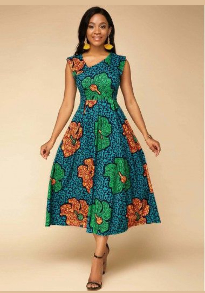 7. Sleeveless Ankara Fit and Flare Gown: Flaunt your feminine side with a sleeveless Ankara fit and flare gown that accentuates your curves and exudes grace.