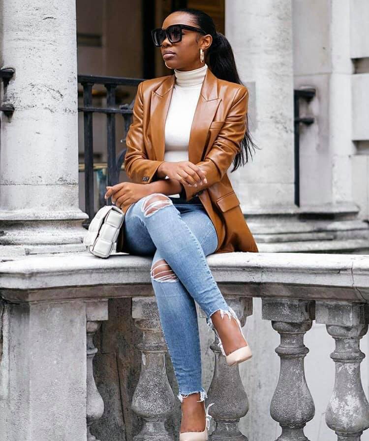 Combine the coolness of leather with the casualness of jeans for an edgy and stylish outfit. Pair black skinny jeans with a leather jacket and a graphic tee. Add ankle boots and accessorize with statement earrings or a bold belt to complete the rock-chic vibe.