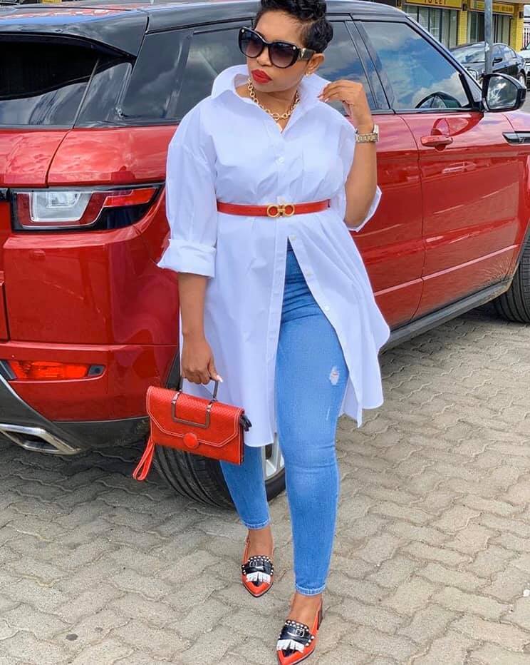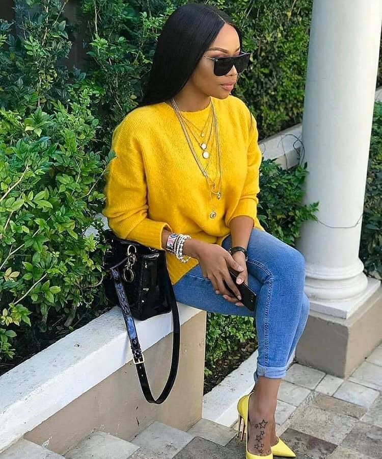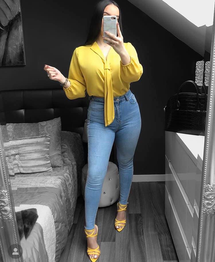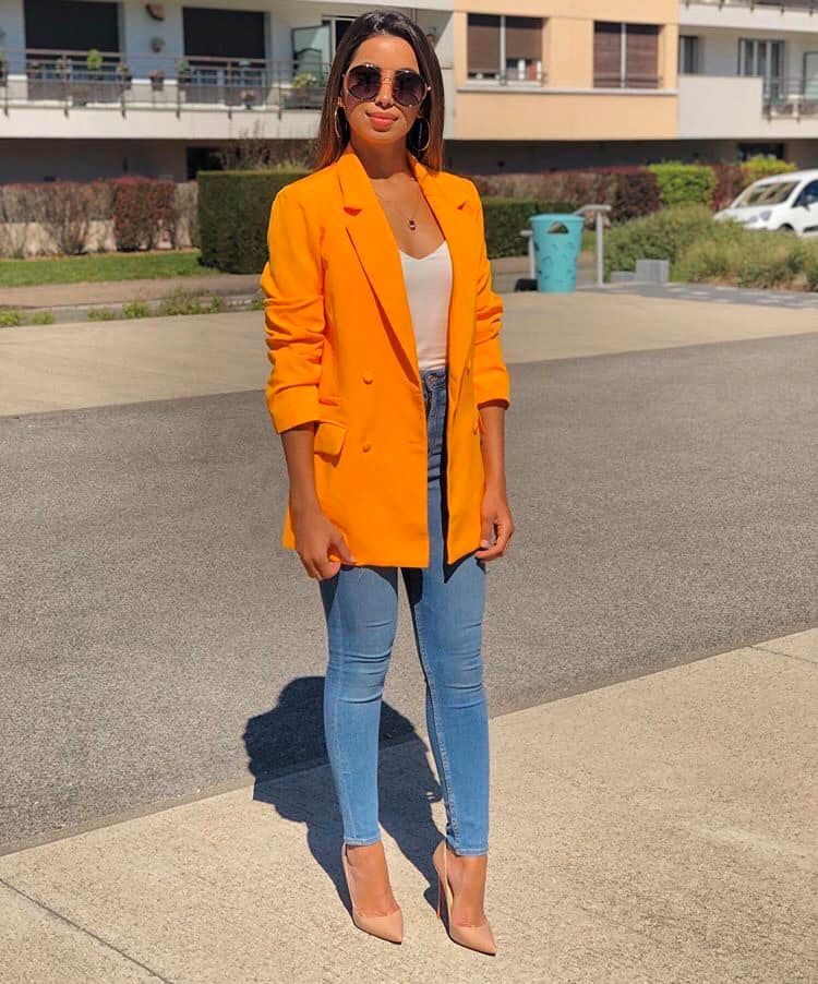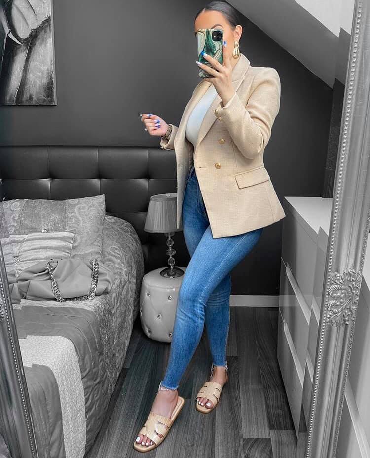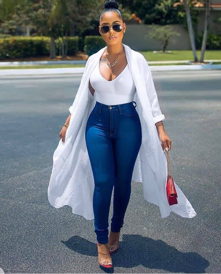 Elevate your jeans with a tailored blazer for a sophisticated and polished outfit. Choose a fitted blazer in a neutral color and pair it with high-waisted jeans and a blouse or a crisp white shirt. Complete the ensemble with heels or loafers for a stylish business-casual look.