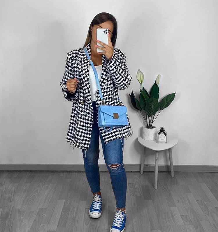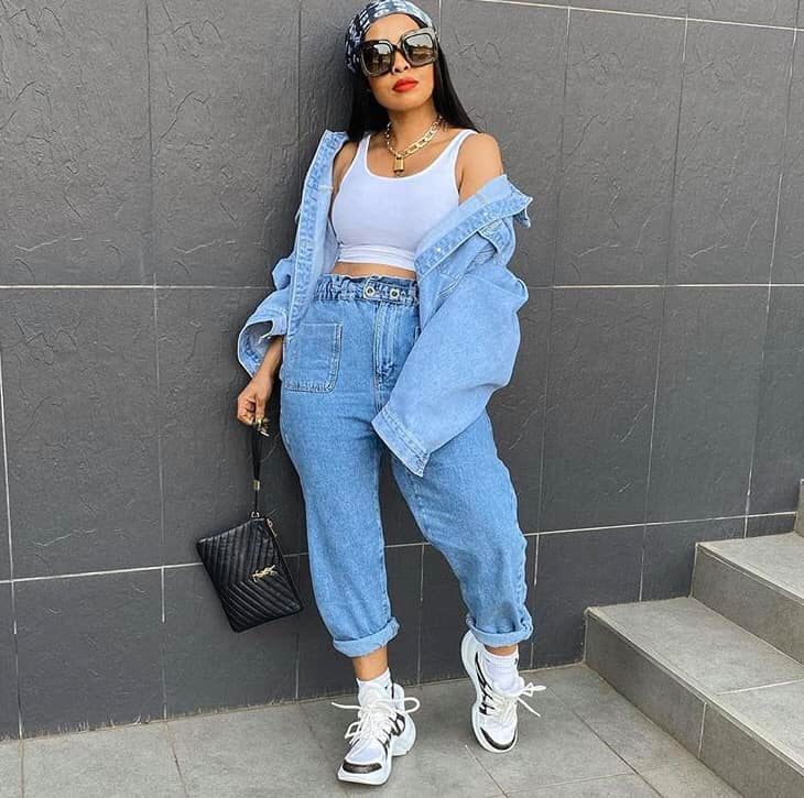 - High-Waisted Jeans: Start with a pair of high-waisted medium wash jeans. Tuck in a white graphic tee and add a denim jacket for a classic casual look. Complete it with white sneakers and a black crossbody bag.