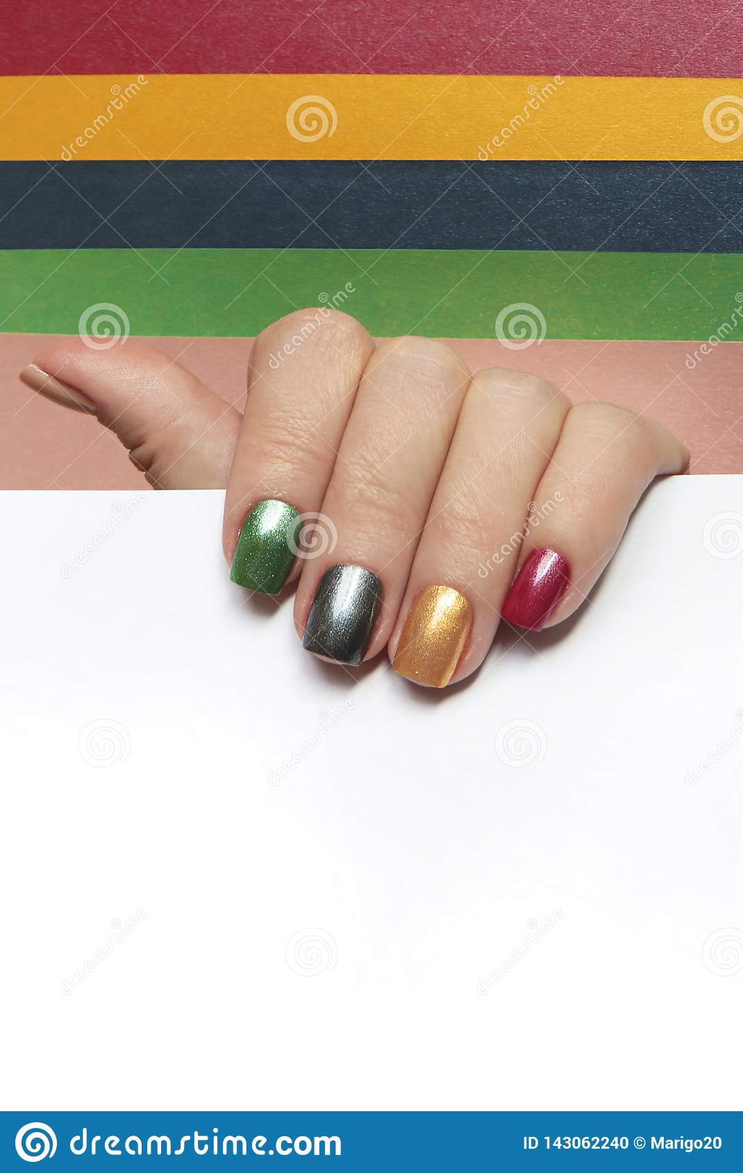 multi-colored-mother-pearl-manicure-short-nails-nail-art-design-red-green-gray-beige-golden-yellow-polish-143062240