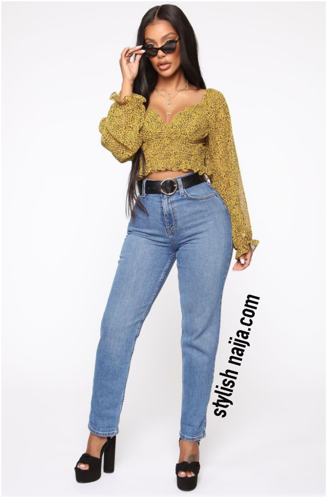 7. Straight-Leg Jeans with Statement Top: Elevate the simplicity of straight-leg jeans by pairing them with a bold and eye-catching statement top. Choose a top with unique details or vibrant colors for a standout look.