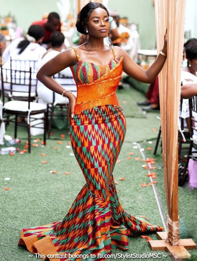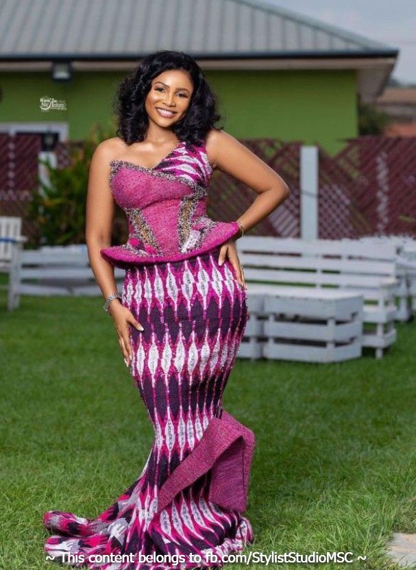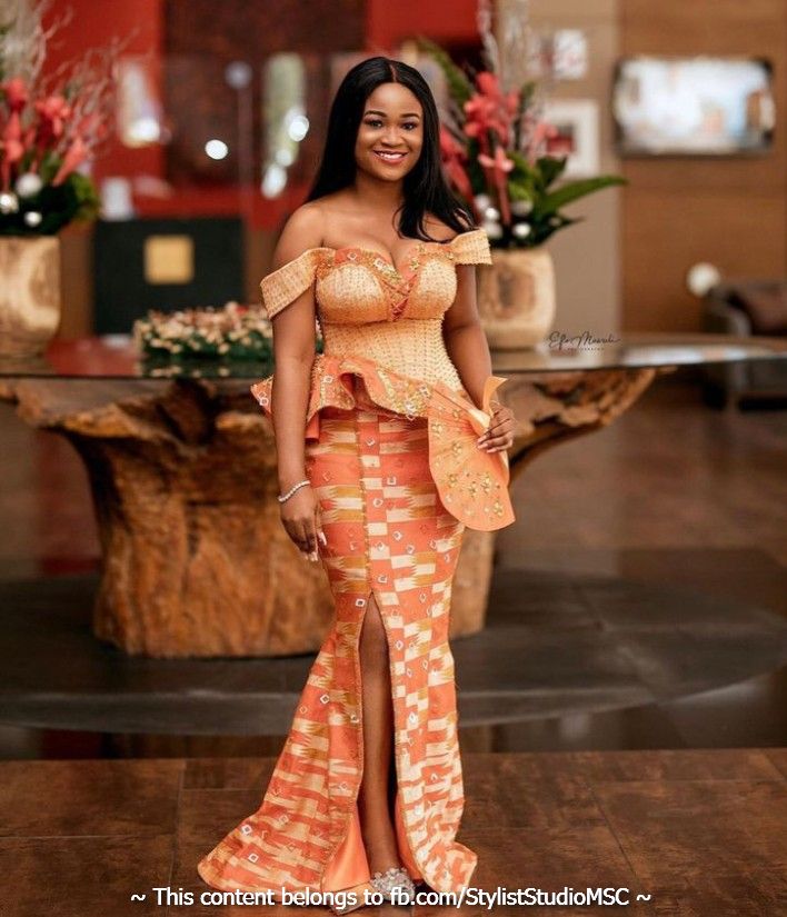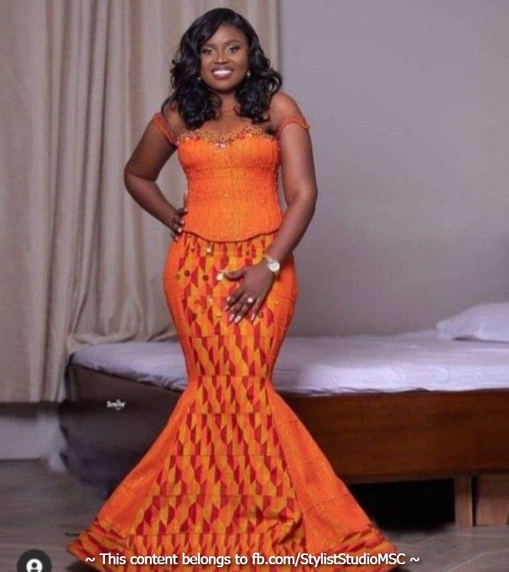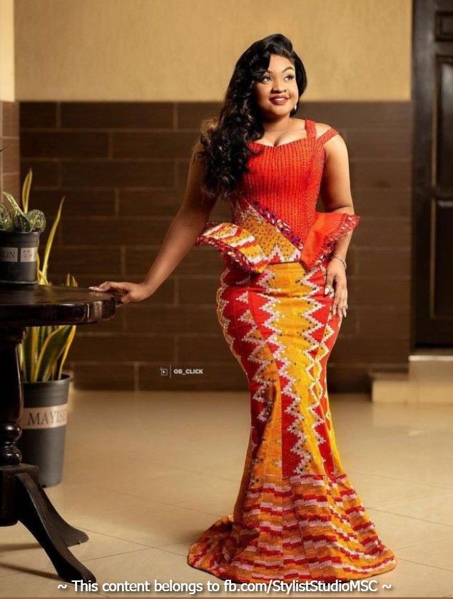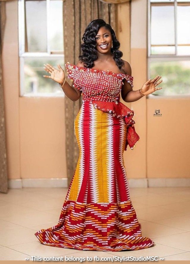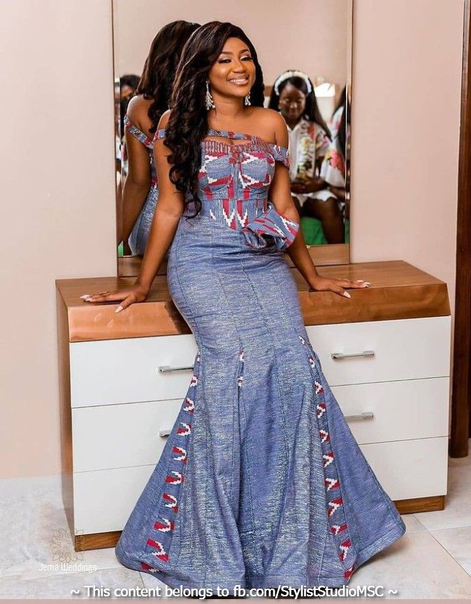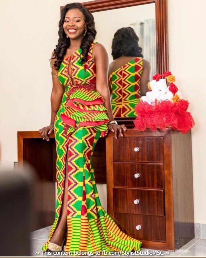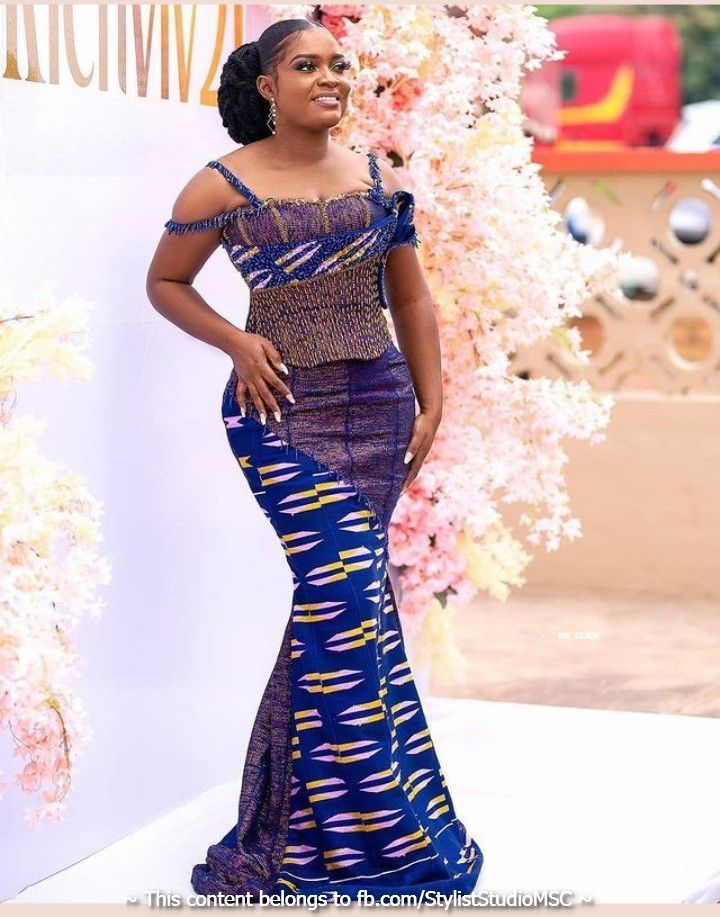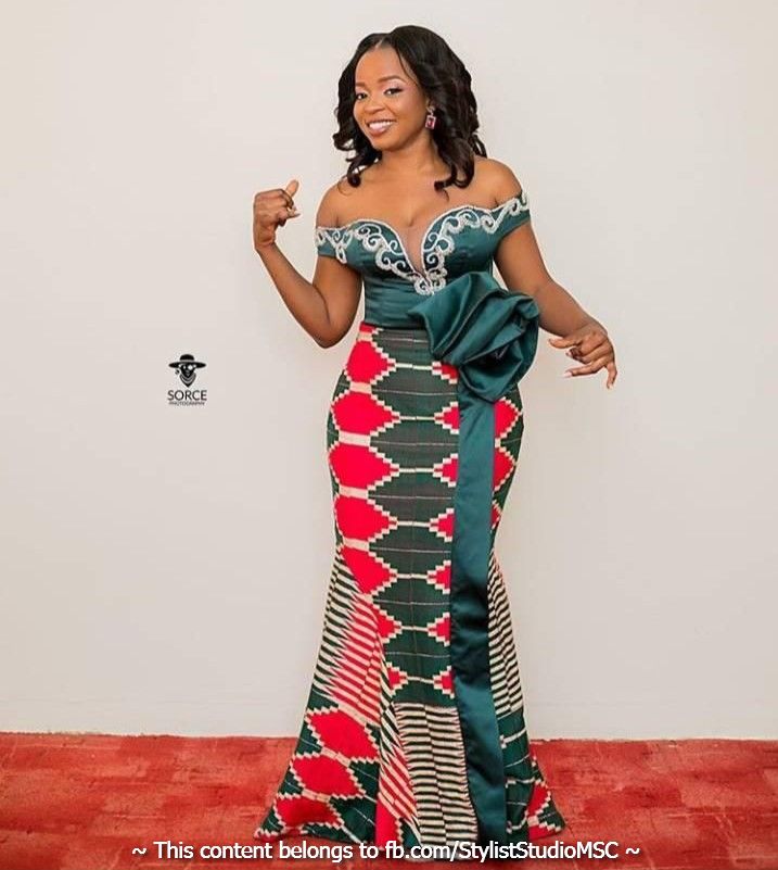 The flowy silhouette of a gown perfectly showcases the intricate patterns and vibrant colors of Kente. Opt for off-shoulder or strapless designs for added sophistication.