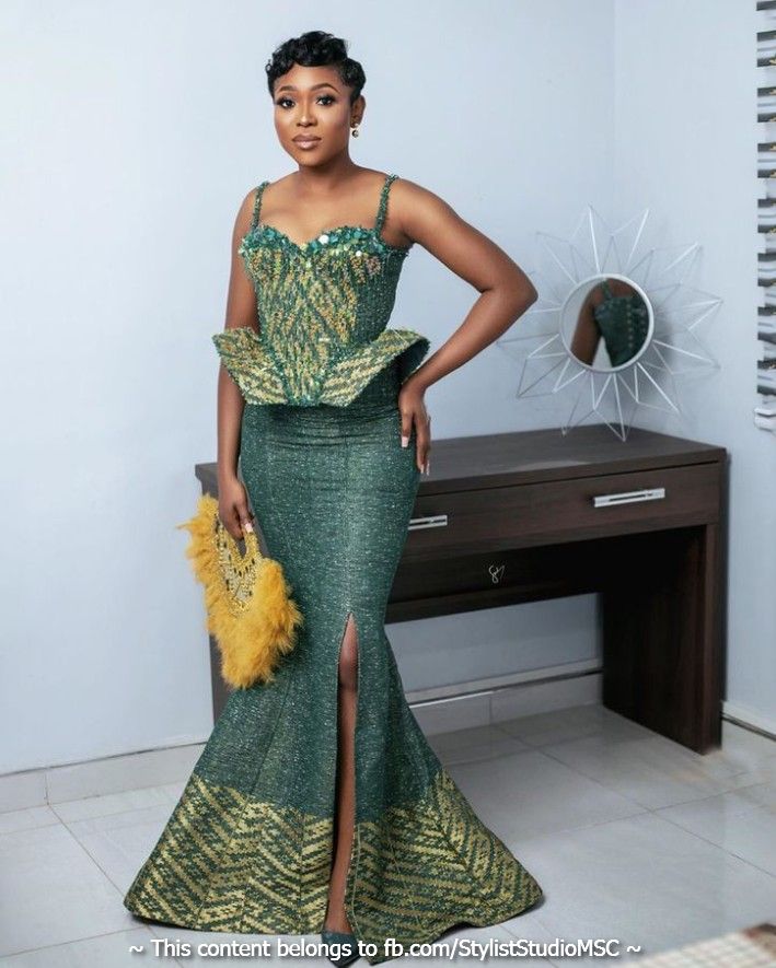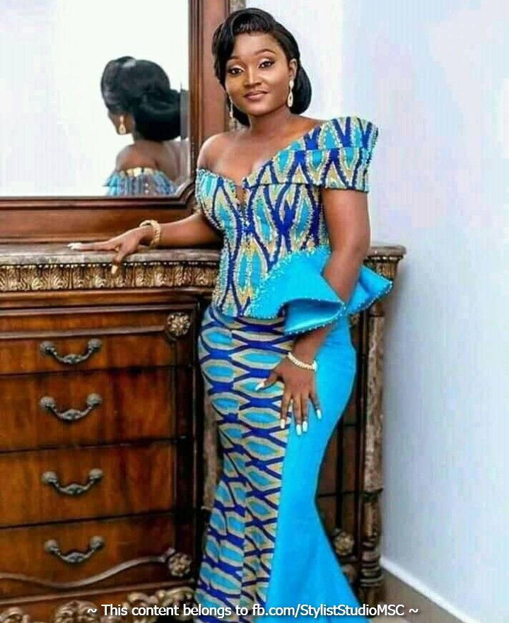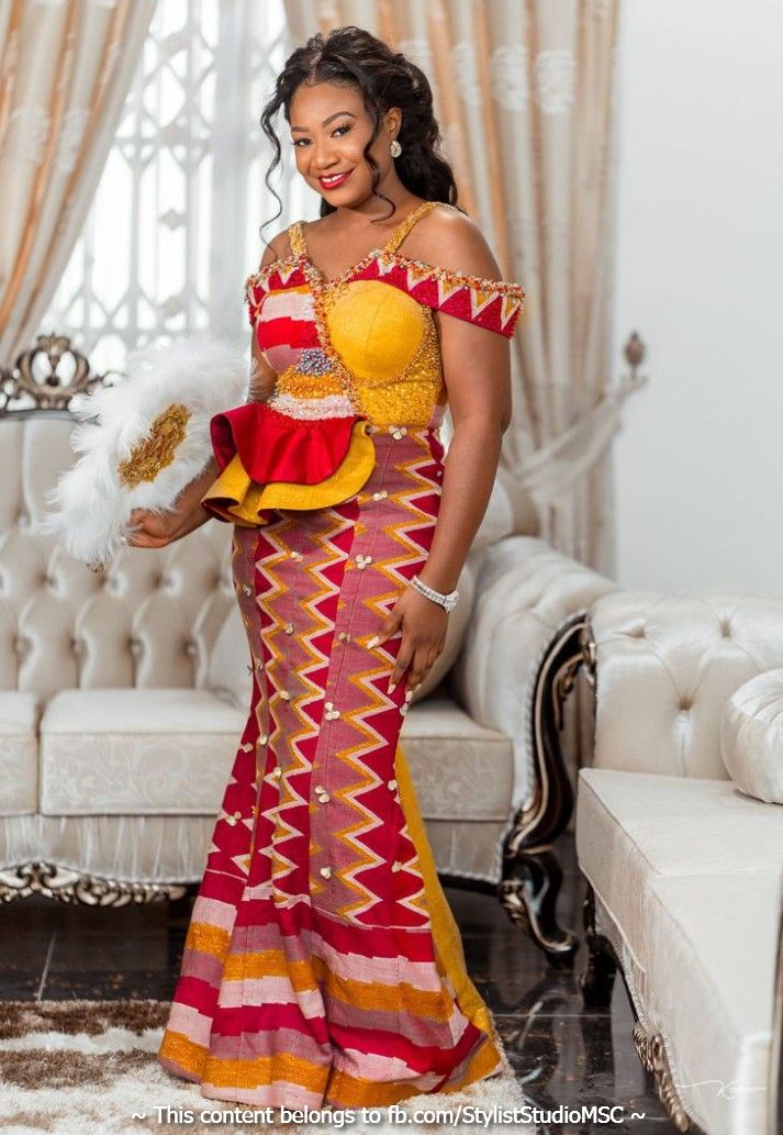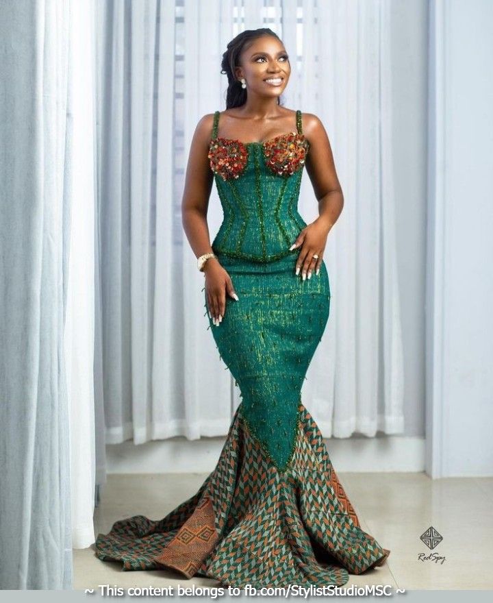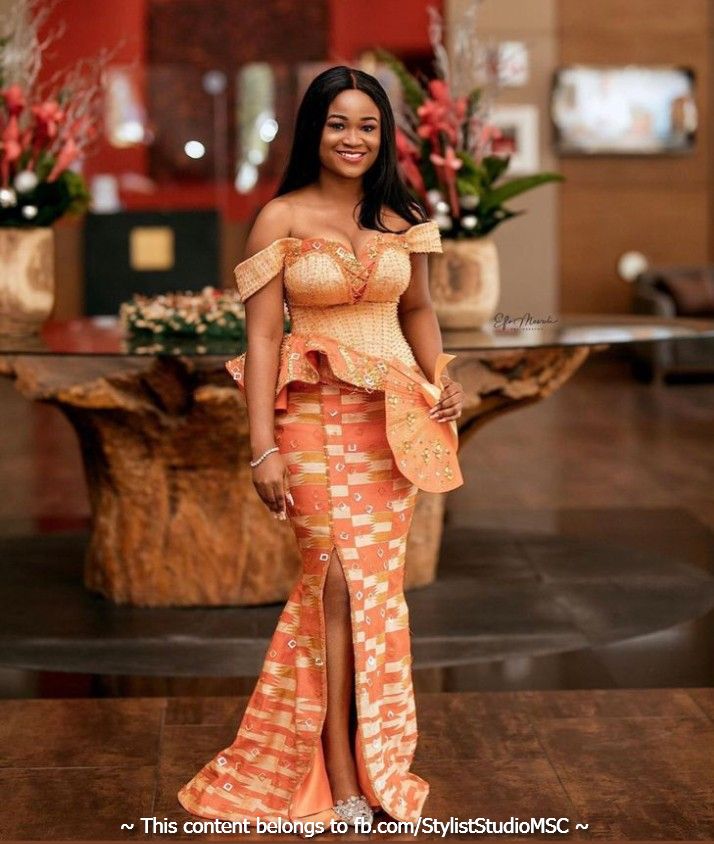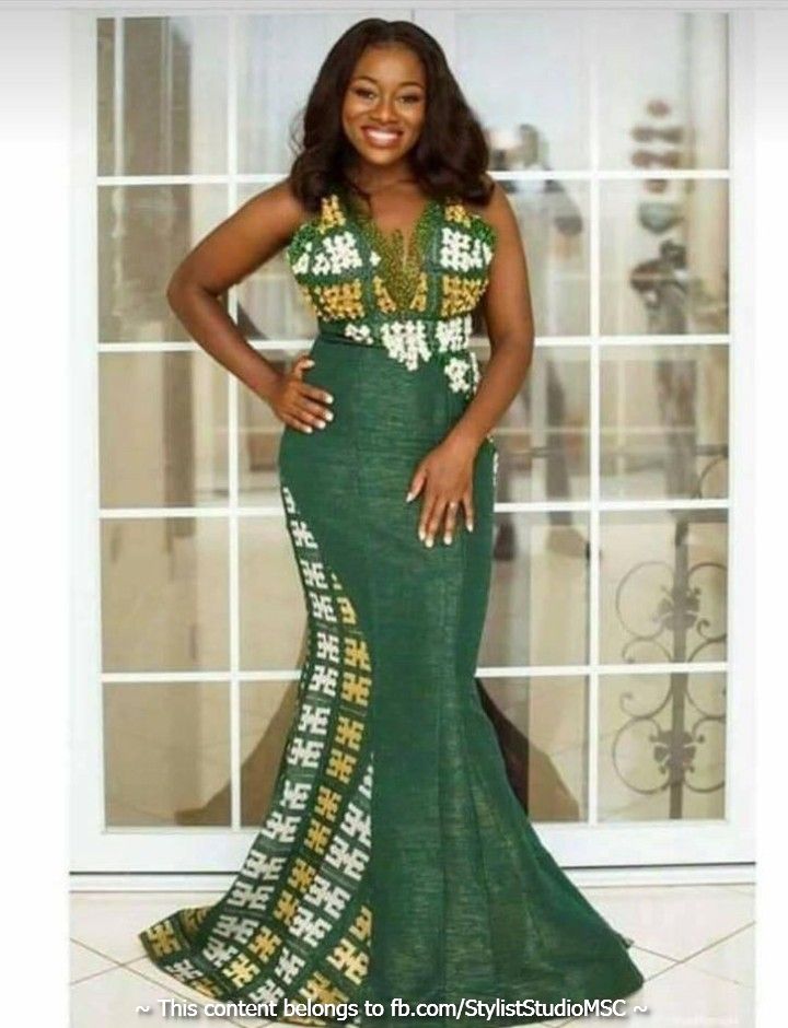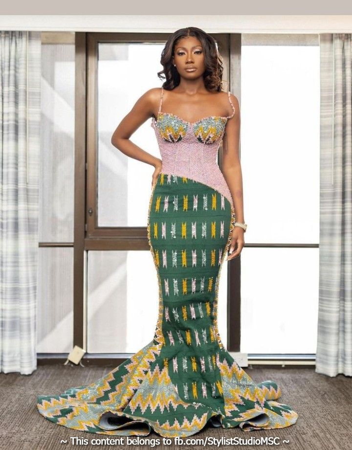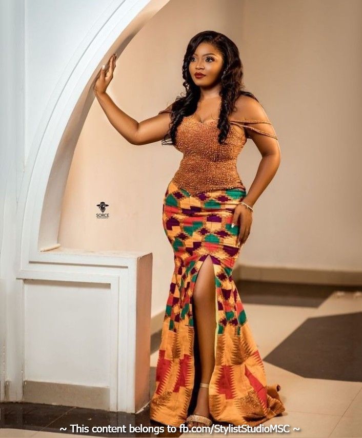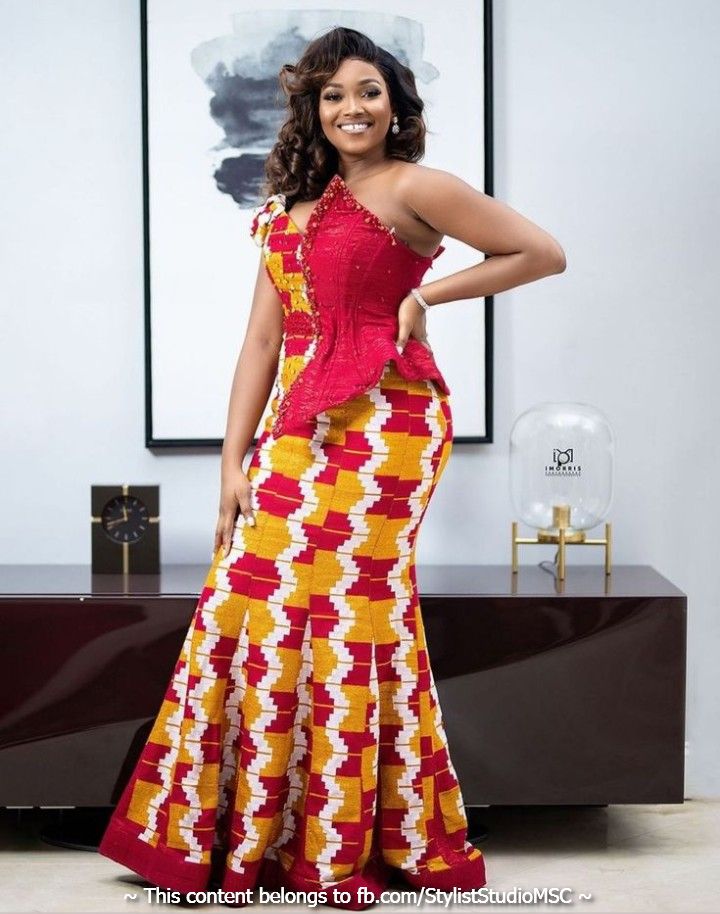 The flowy silhouette of a gown perfectly showcases the intricate patterns and vibrant colors of Kente. Opt for off-shoulder or strapless designs for added sophistication.