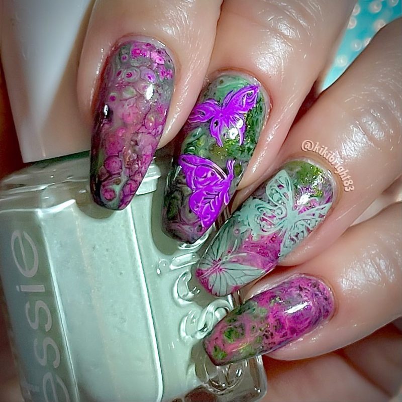 My sage and magenta butterfly design with fluid art decals and stamping for this month?s Butterfly collab. I used so many polishes I forgot which ones. I love this color combo, I jumped right on getting it done nearly a month ago. I do know I used a DIY fluid art polish. I?m telling you the Garnier Fruitis Sleek & Shine hair serum is a great way to try out making your own fluid art polishes. A few indies do make them and tbh they are better quality IMO, but this works in a bind or if you need to make a specific color you don?t have on hand. I usually use a cheap polish from Sally Hansen or Poparazzi (the CVS brand) to make it.