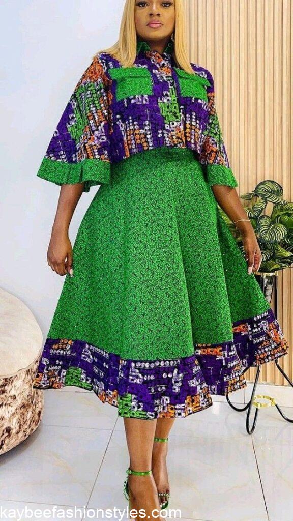 One of how the two piece Ankara outfit can be styled is as a skirt and top. This can be in the form of a short skirt paired with a crop top or a maxi skirt and top. Whichever way you choose to rock it is fashionable.