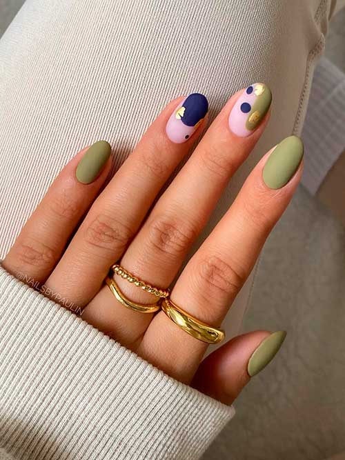 Matte-Olive-Green-Nails-with-Two-Abstract-Accent-Nails