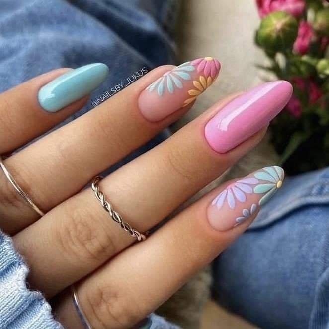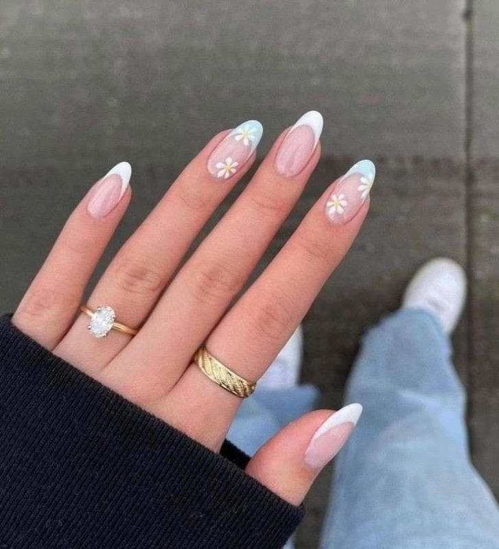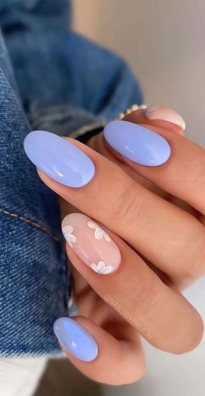 3. Baby Blue Bliss: Embrace the serenity of baby blue with a clean and minimalist nail design. Paint your nails with a soft blue shade and adorn them with tiny silver or white dots for a whimsical touch.