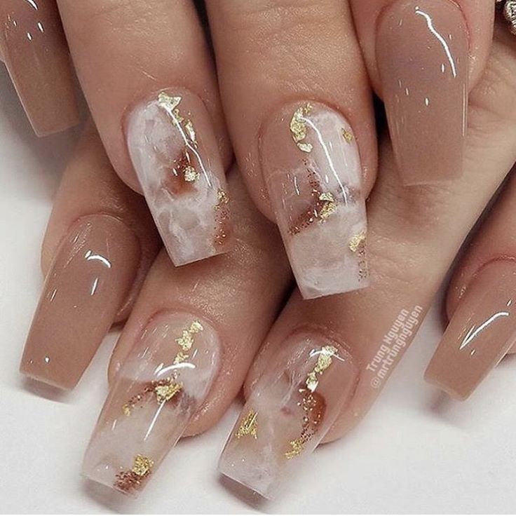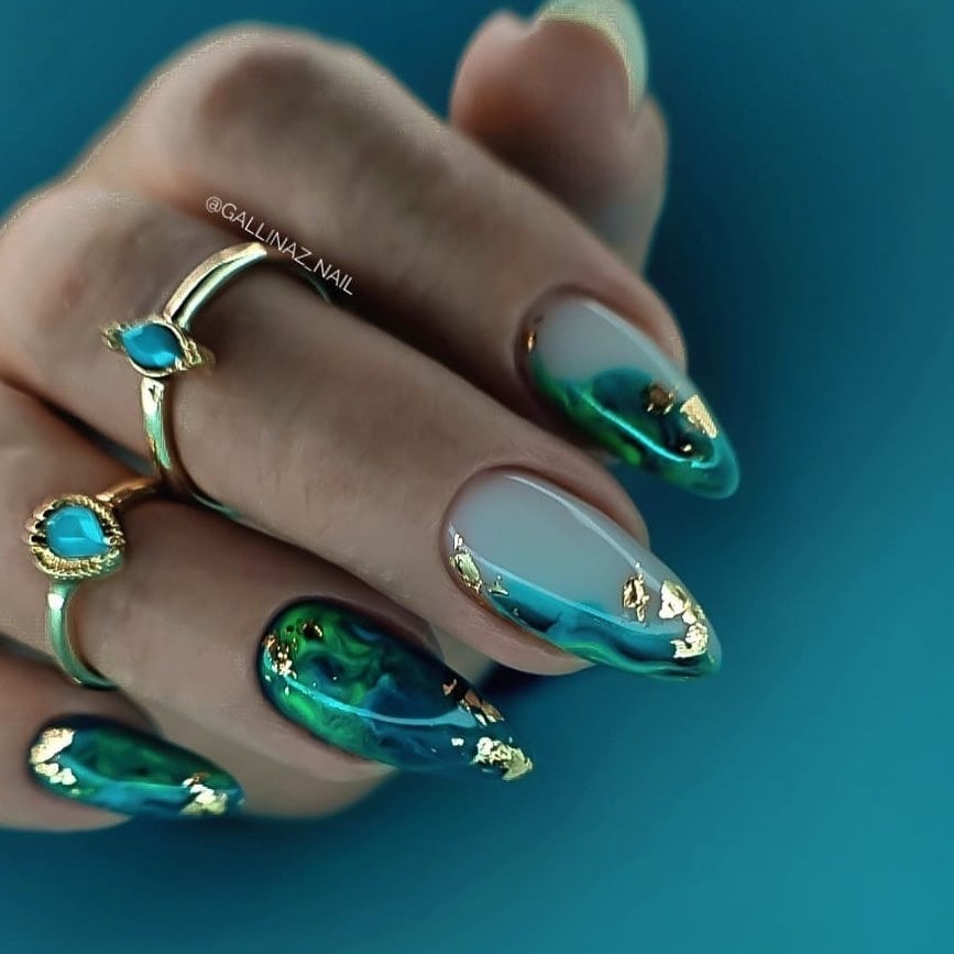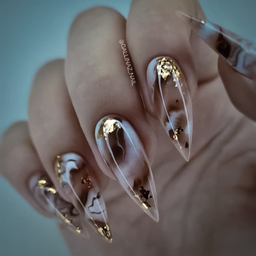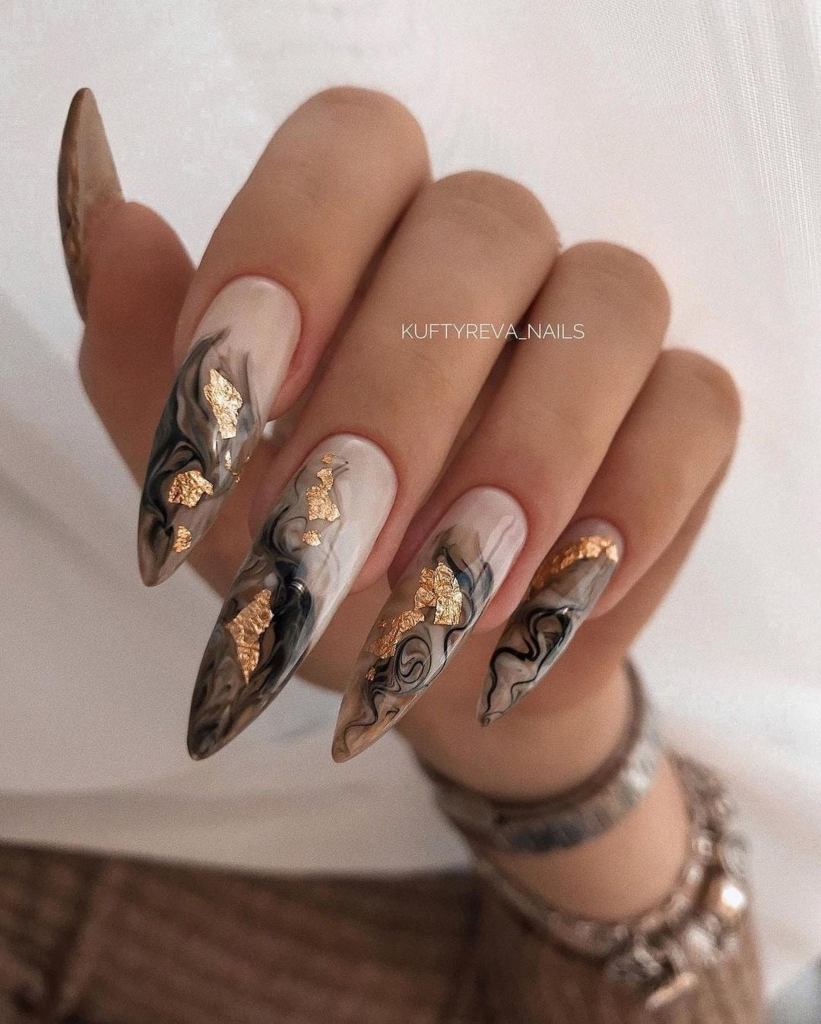 33. Gold Water Marble Nails: Use gold polish in a water marble technique to achieve a mesmerizing and marbled effect.