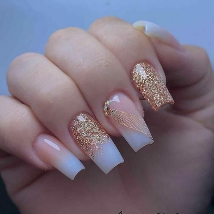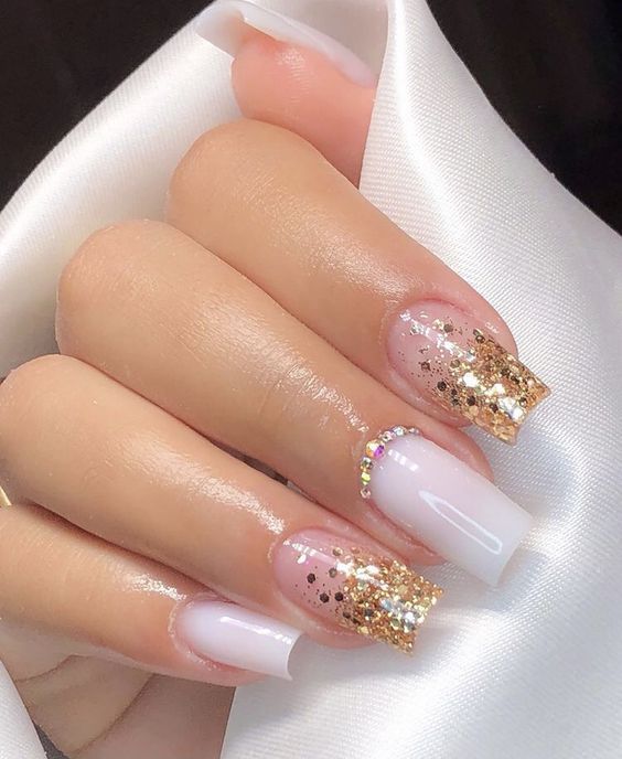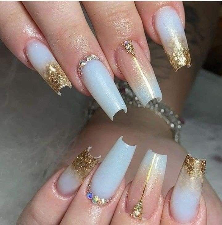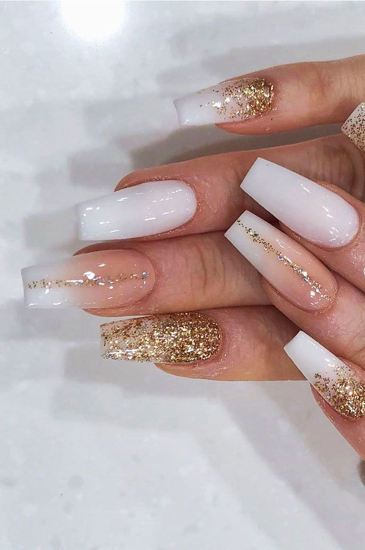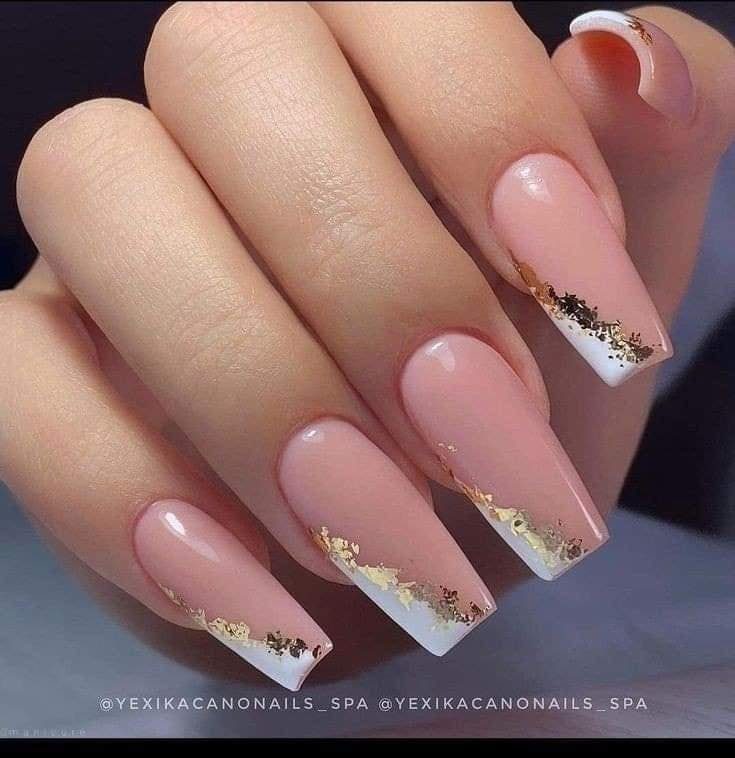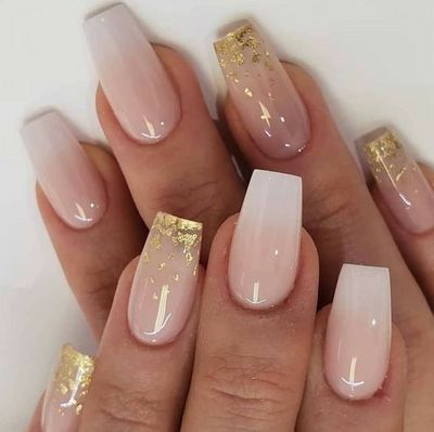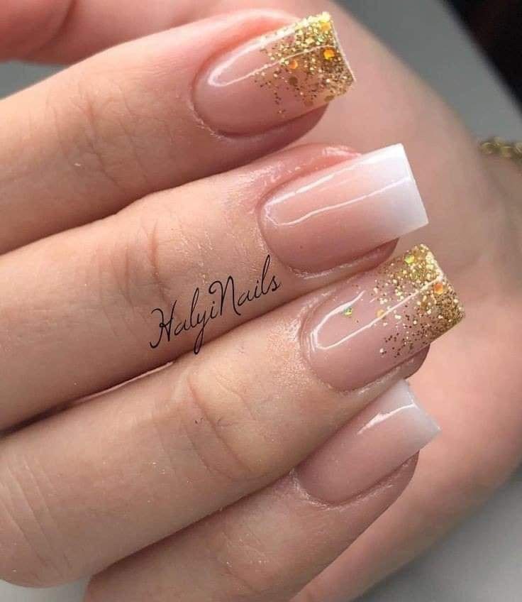 20. Gold French Fade: Blend gold polish with a neutral shade to create a soft and gradient French fade.