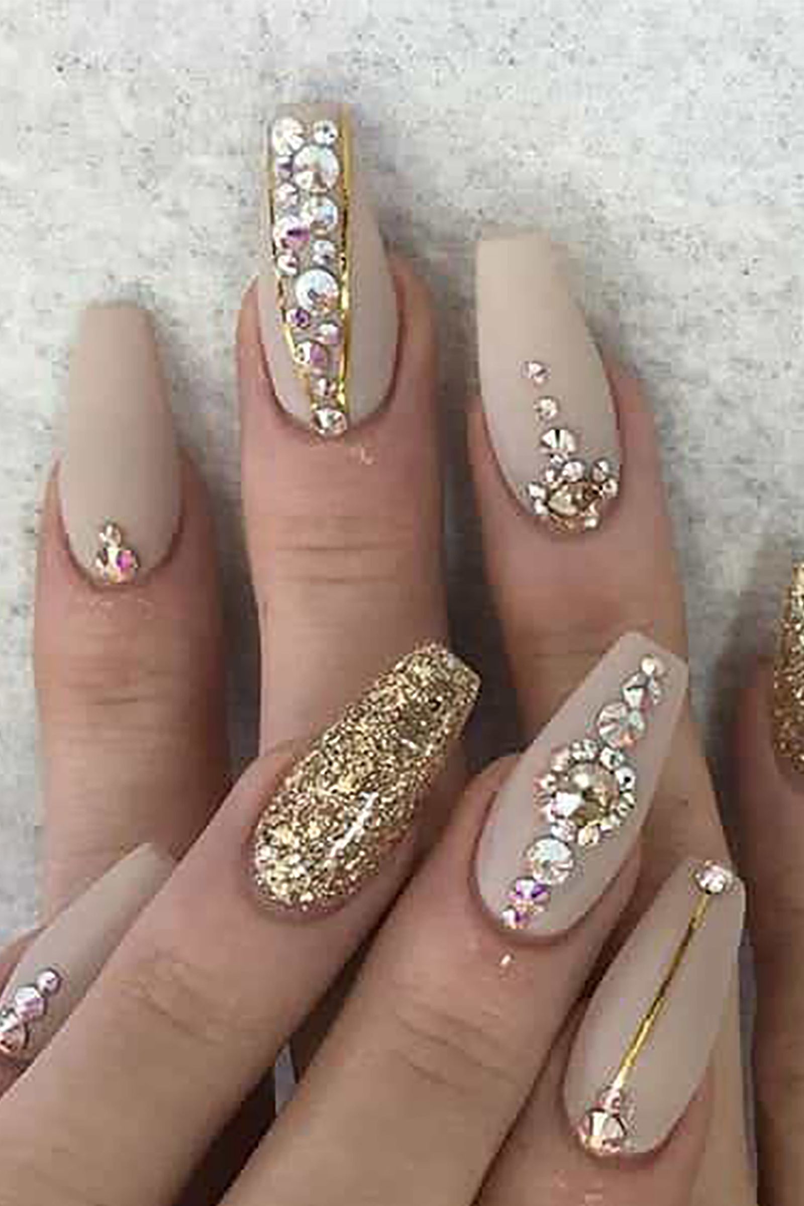 11. Gold Studded Nails: Apply gold studs or embellishments to add texture and dimension to your nails.