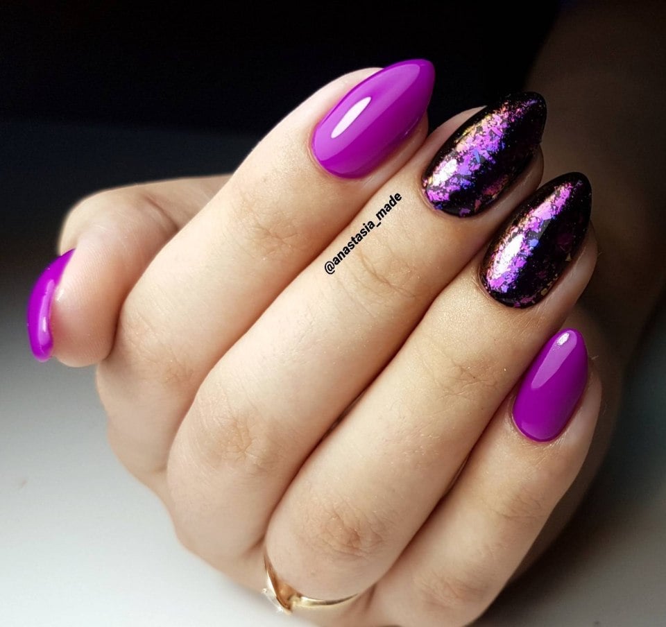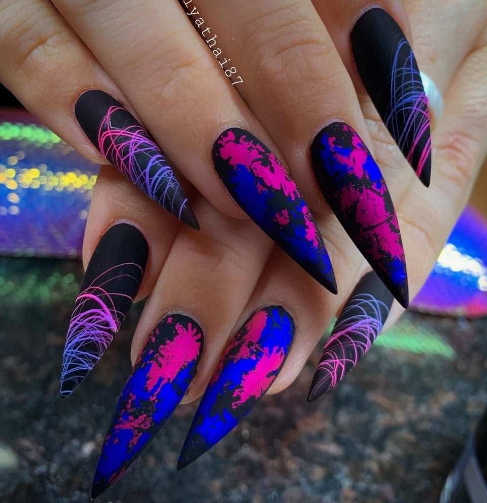 9. Neon Galaxy: Create a galactic design using neon colors. Apply a black or dark blue base coat, then use neon shades to paint stars, swirls, and other celestial elements on top. Finish with a coat of glitter polish for a stellar effect.