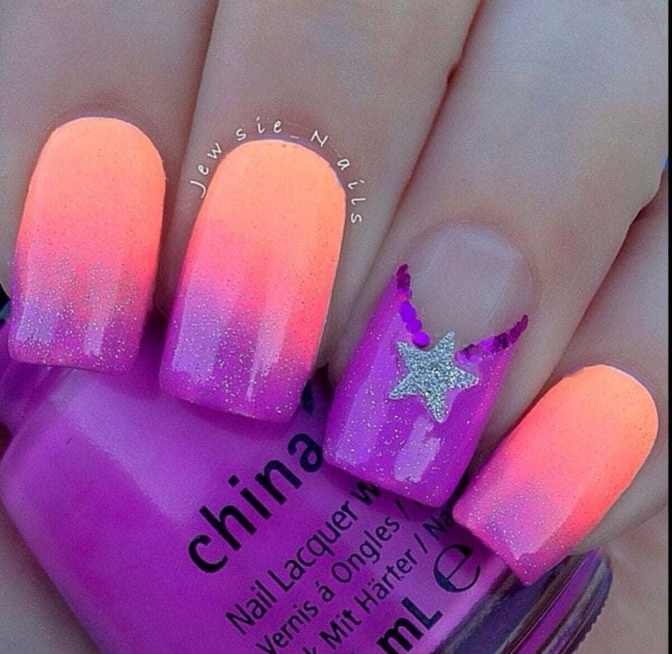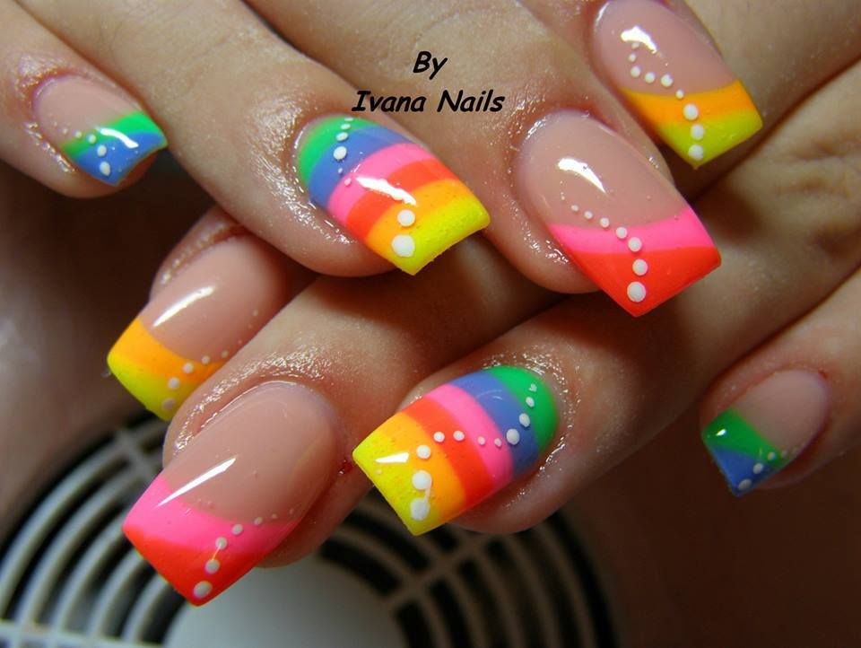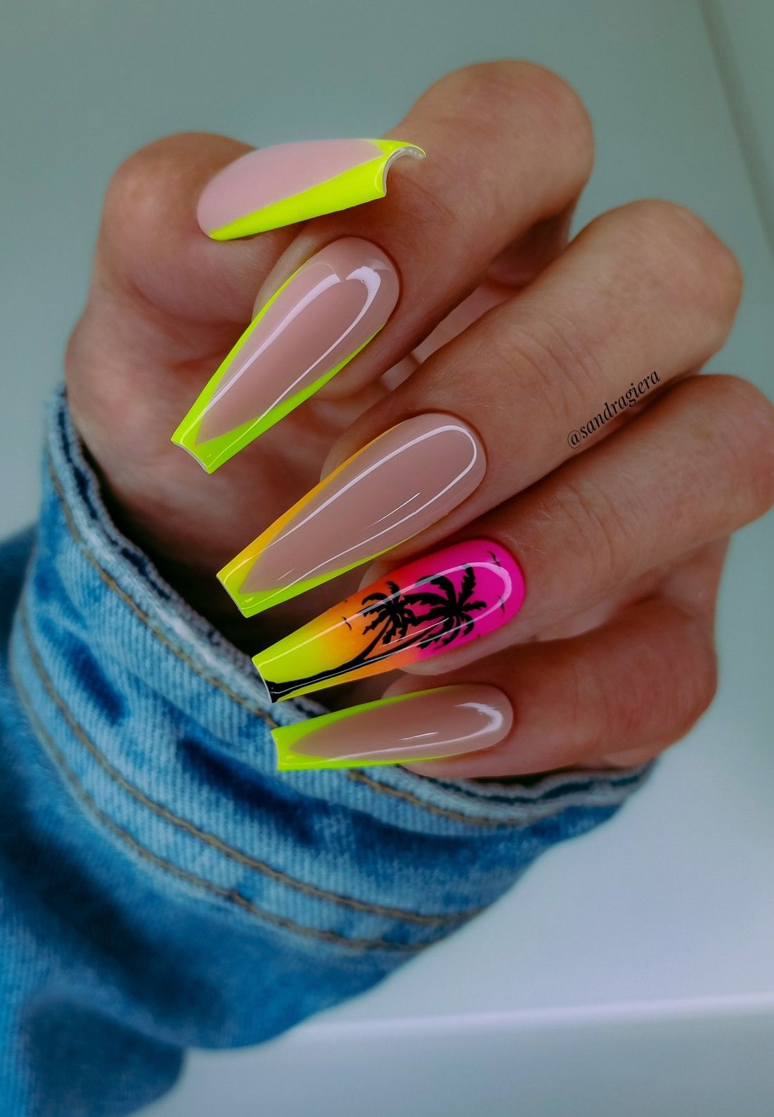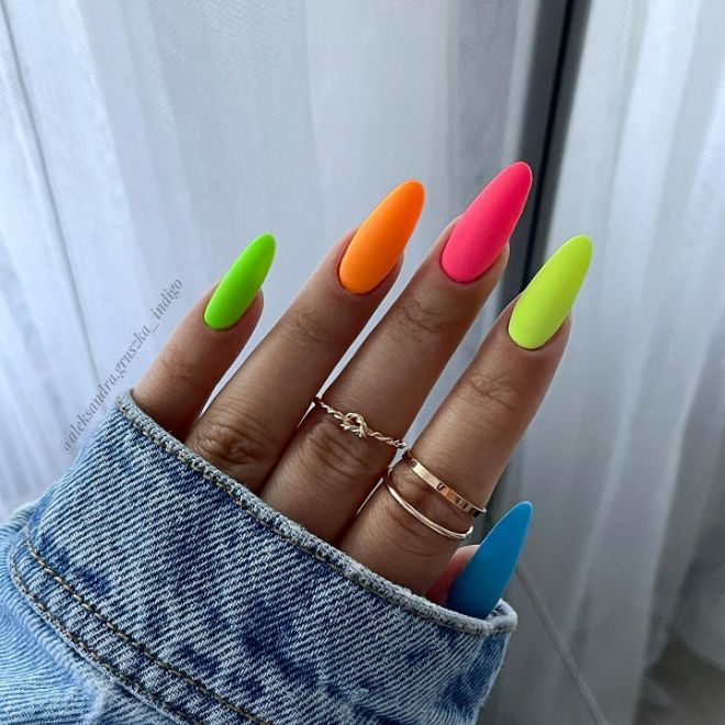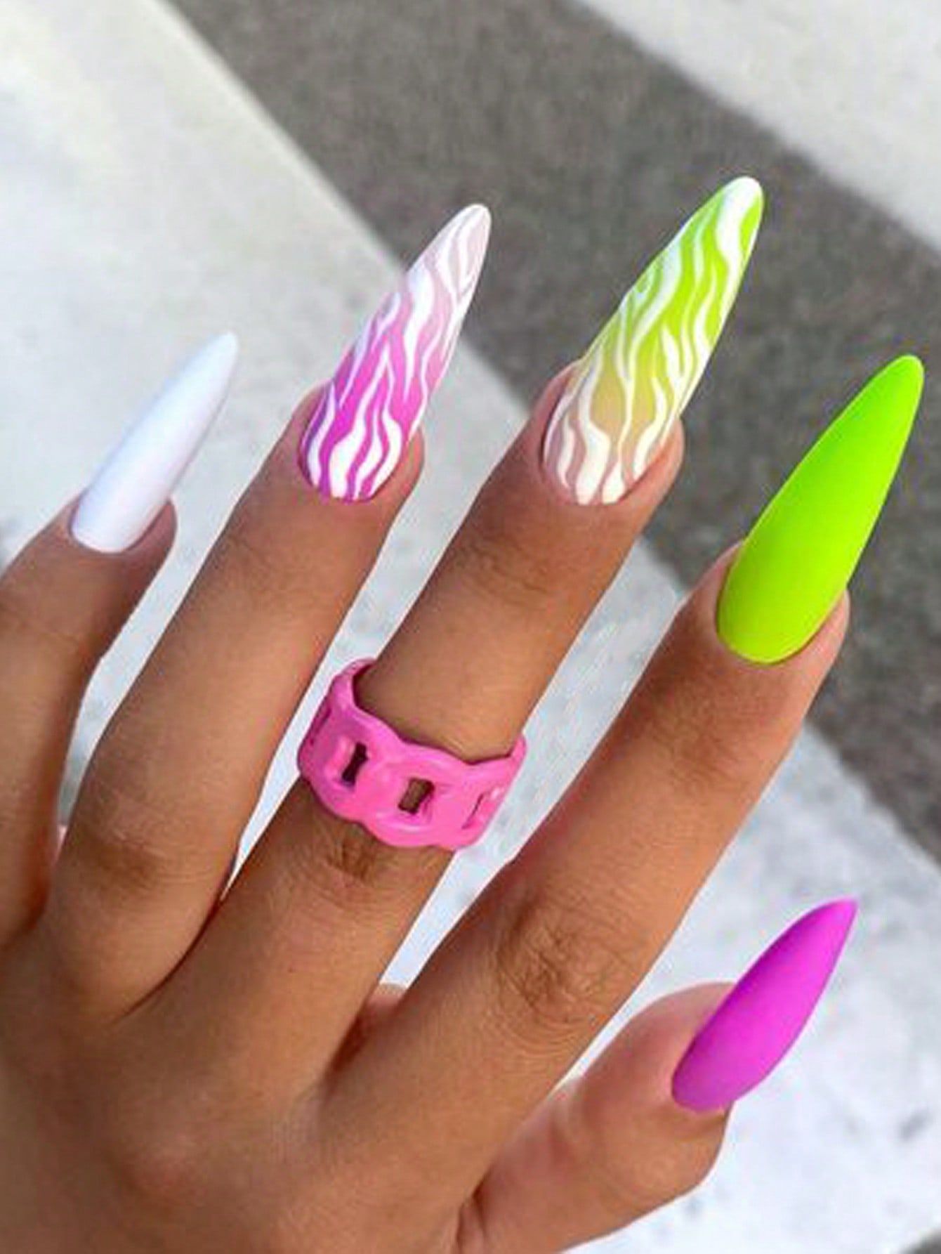7. Neon Gradient: Choose three or more neon colors that blend well together and create a gradient effect by painting each color on a different part of the nail. Blend the colors where they meet for a seamless and colorful transition.