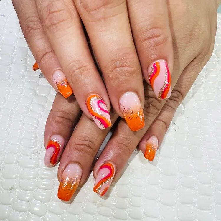 Orange-Ombre-Coffin-Nails-With-Swirls
