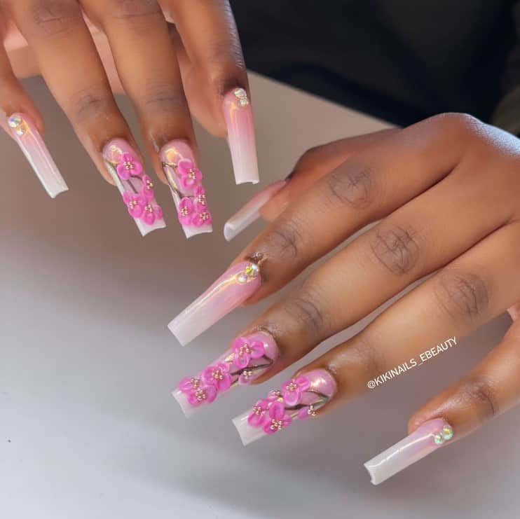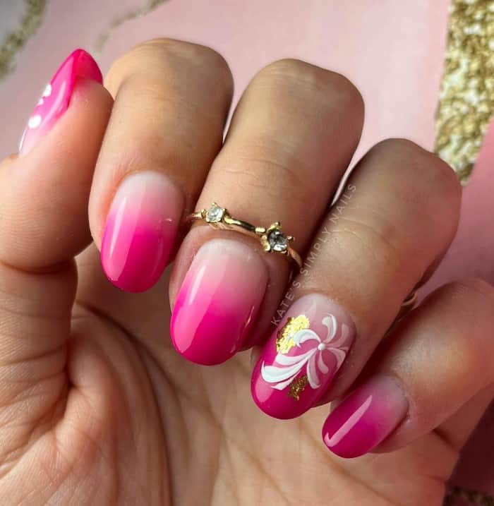 Bring the beauty of nature to your nails with floral designs on pink ombré-colored nails.