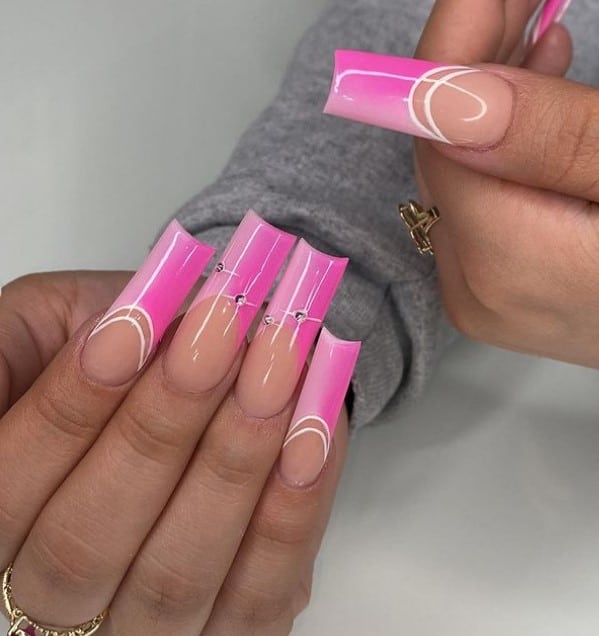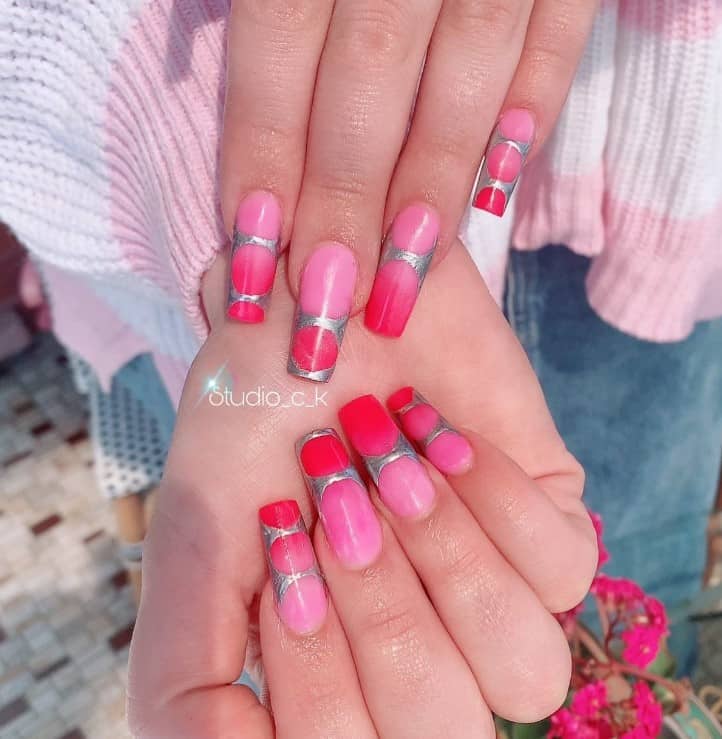 Want to create an artsy and edgy look? Add geometric designs such as clean lines and abstract shapes for a modern or minimalist vibe to your pink ombré nails.