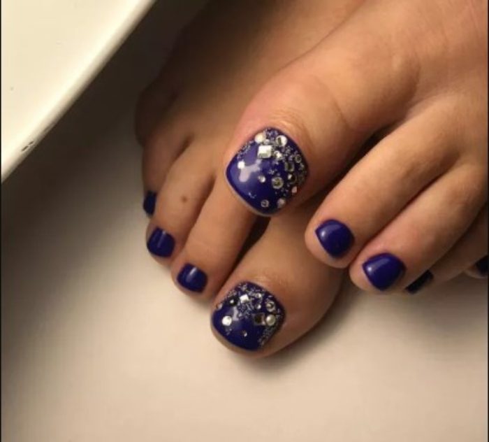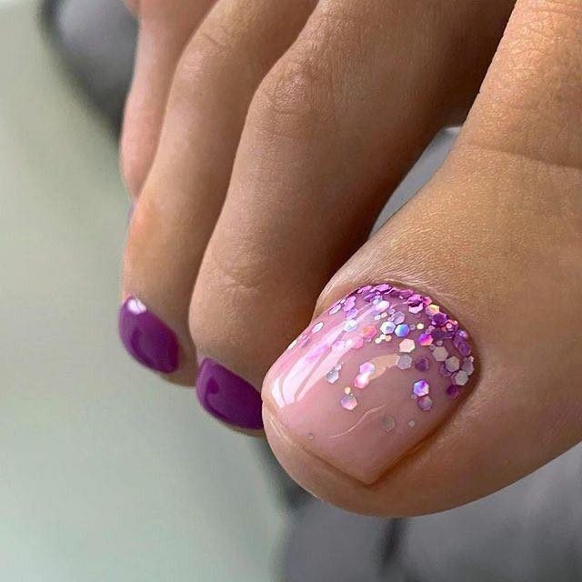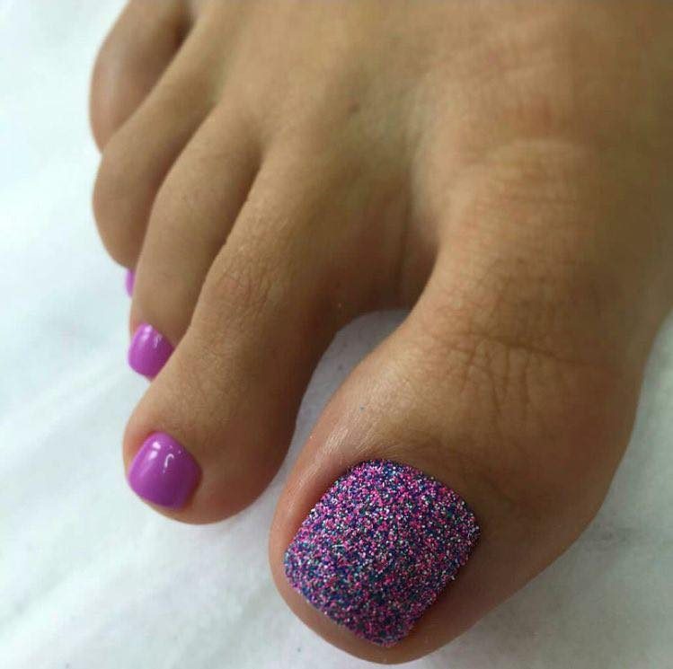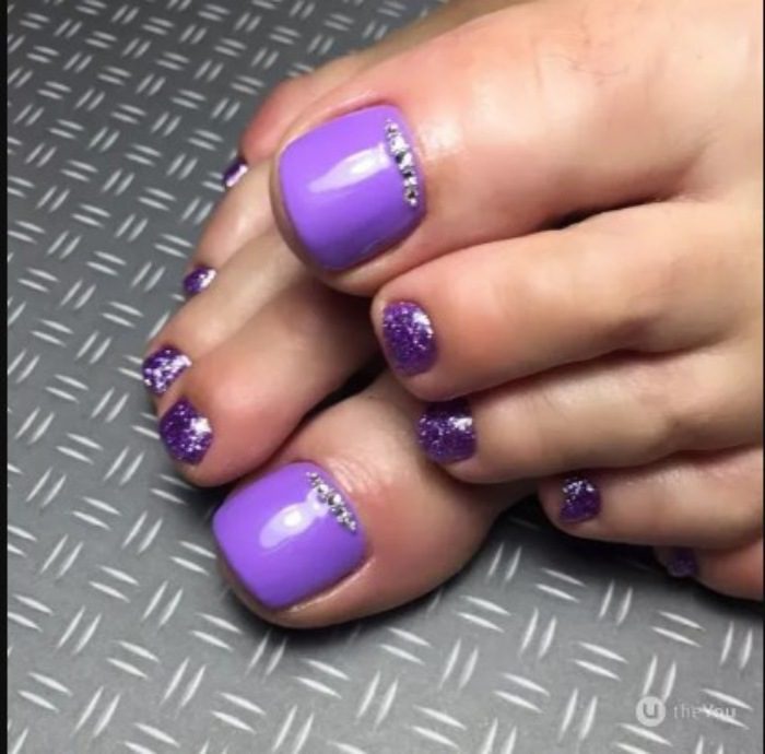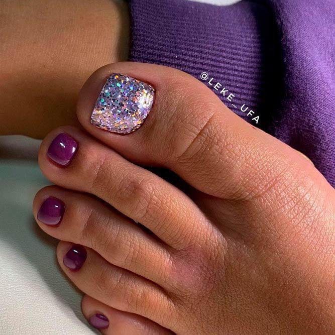 If you love a touch of sparkle, incorporate glitter into your purple pedicure. Apply a rich, deep purple polish as the base and sprinkle glitter over it for a glamorous effect. You can choose chunky glitter for a bold statement or opt for a more subtle shimmer with fine glitter. Either way, your toes will dazzle with every step.