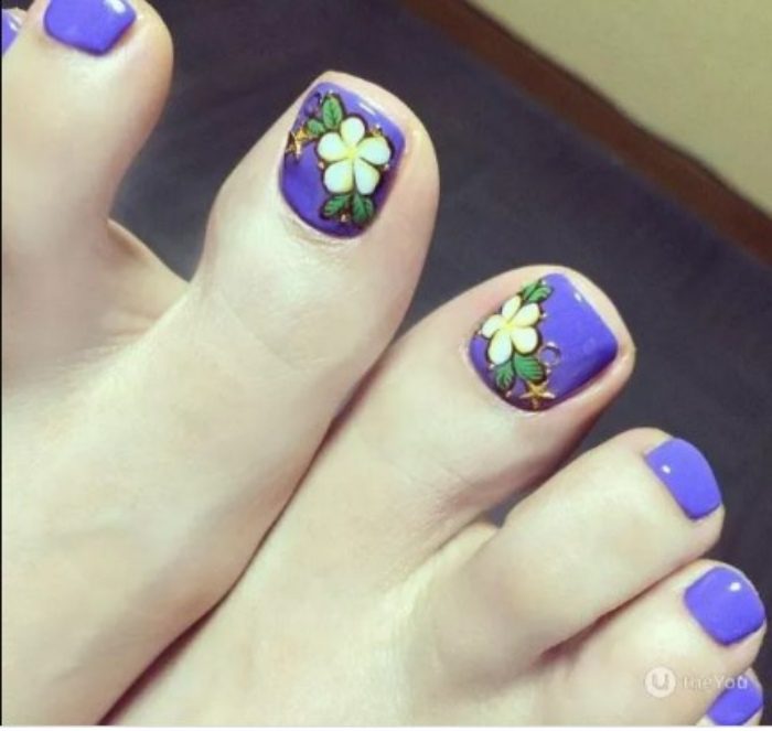 Embrace the beauty of nature by adorning your purple toenails with delicate floral designs. Paint a light purple base and add intricate flower patterns using a darker shade or even contrasting colors like white or pink. These floral accents will bring a touch of femininity and grace to your pedicure.