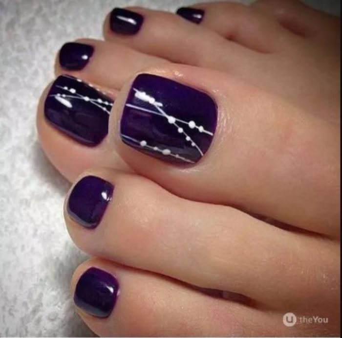 Polka dots are a classic nail design that never goes out of style. Paint your toenails in a vibrant shade of purple and use a contrasting color like white or silver to create playful polka dots. This whimsical pattern adds a fun and youthful element to your pedicure, making it perfect for any occasion.