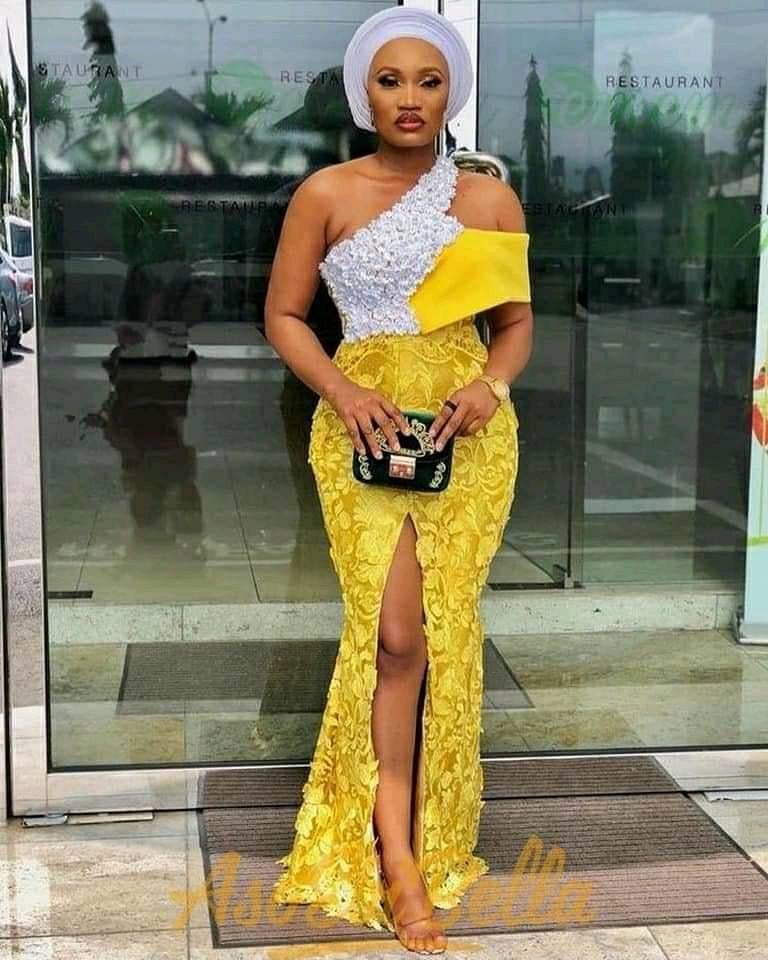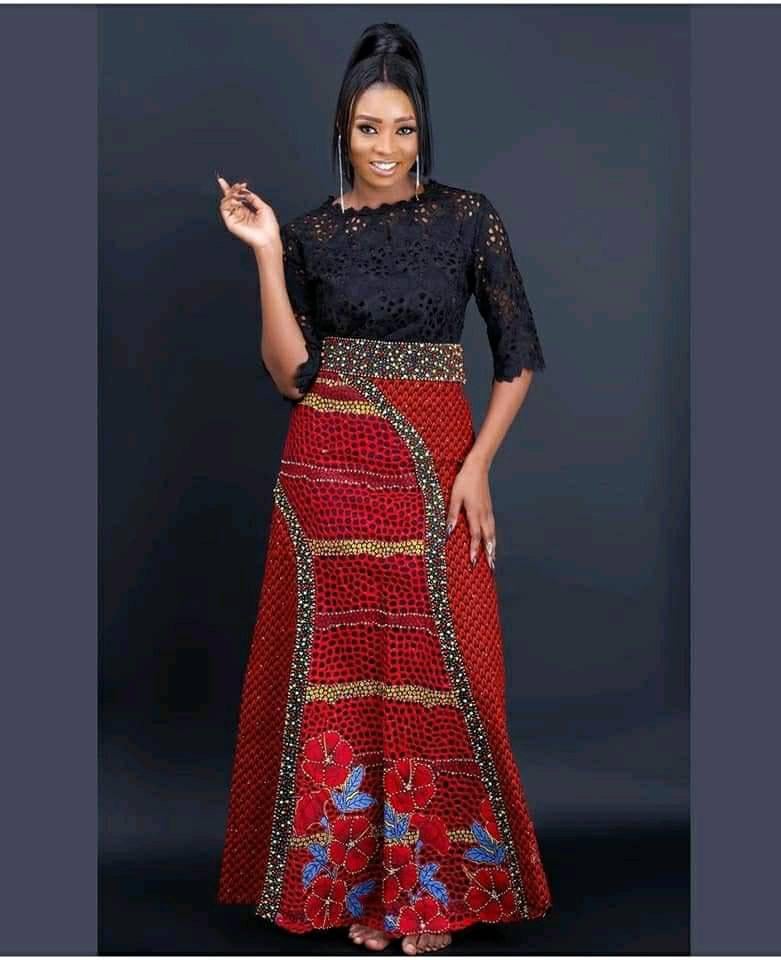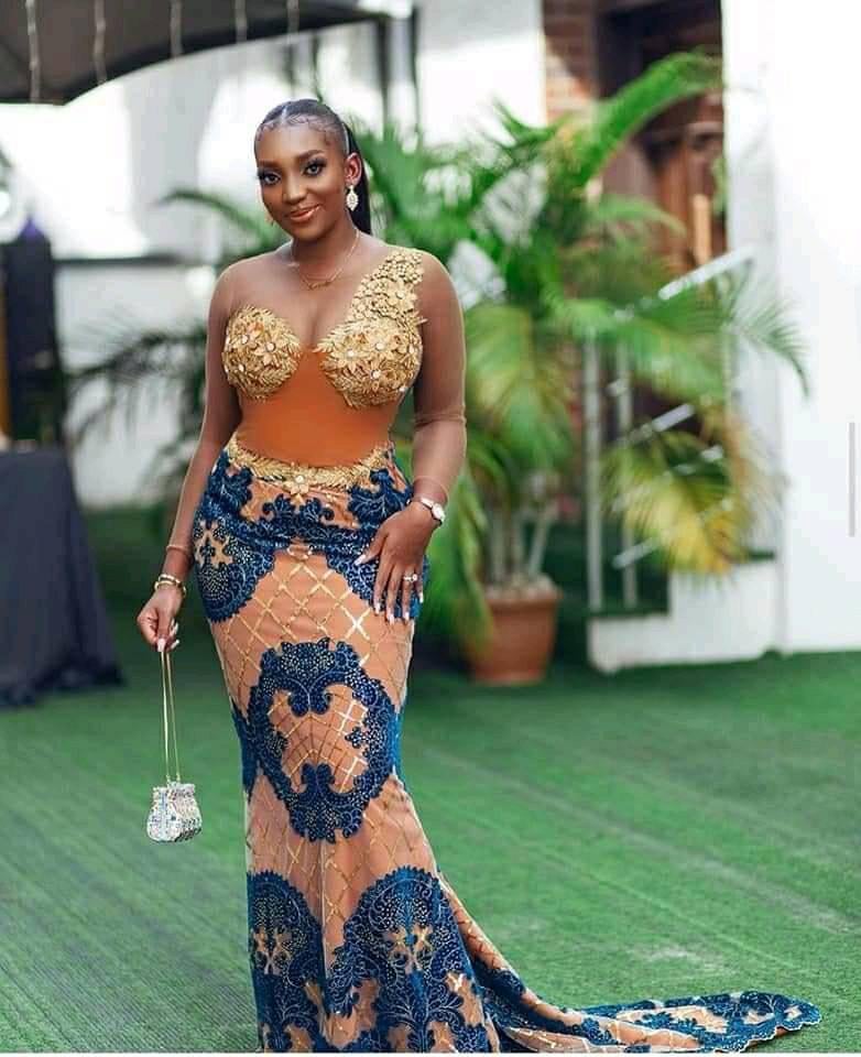 - Features: Full lace gowns or lace details mixed with Ankara or Kente.