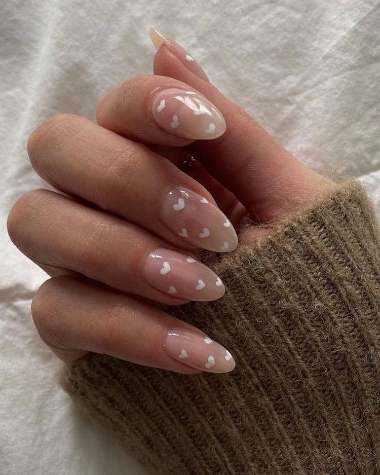 Sheer-Nude-Almond-Nails-With-White-Hearts