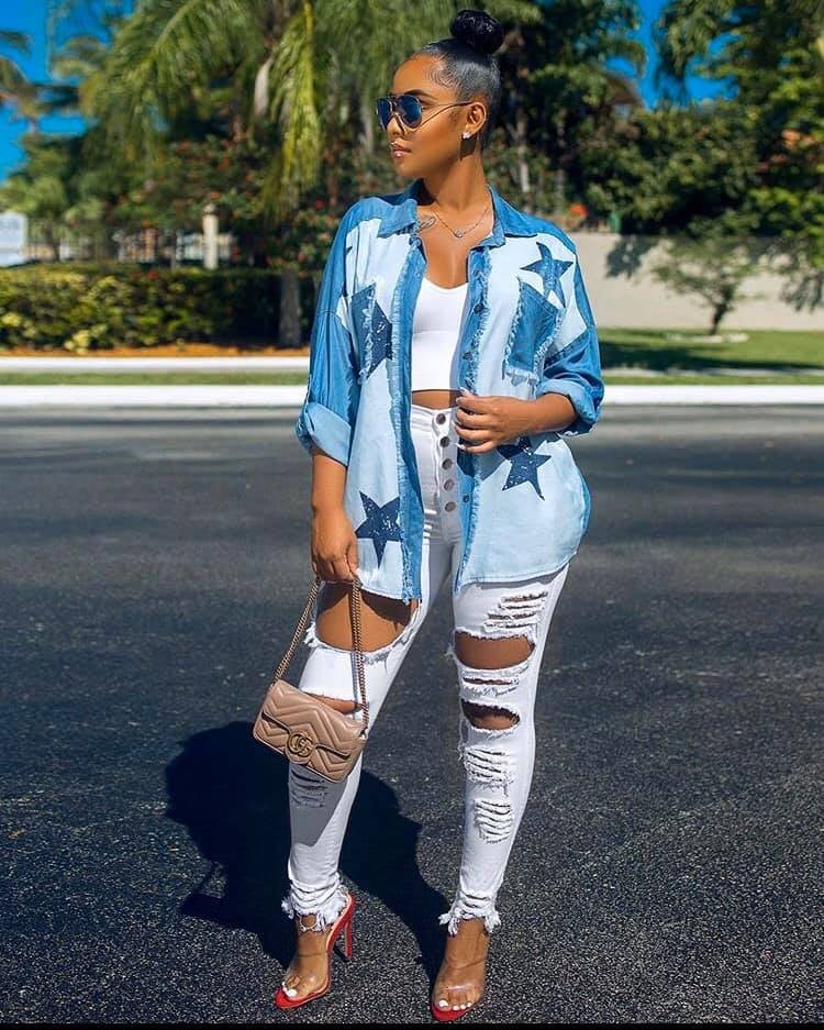 1. Denim jacket + graphic tee + high-waisted jeans: This effortlessly cool combo is perfect for a casual day out.