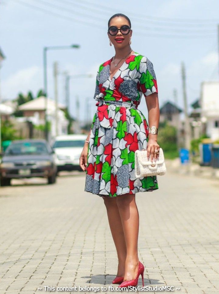 The universally flattering wrap dress gets an African touch with the Ankara print. It hugs the figure at the right places, emphasizing the waist, and flares gracefully.