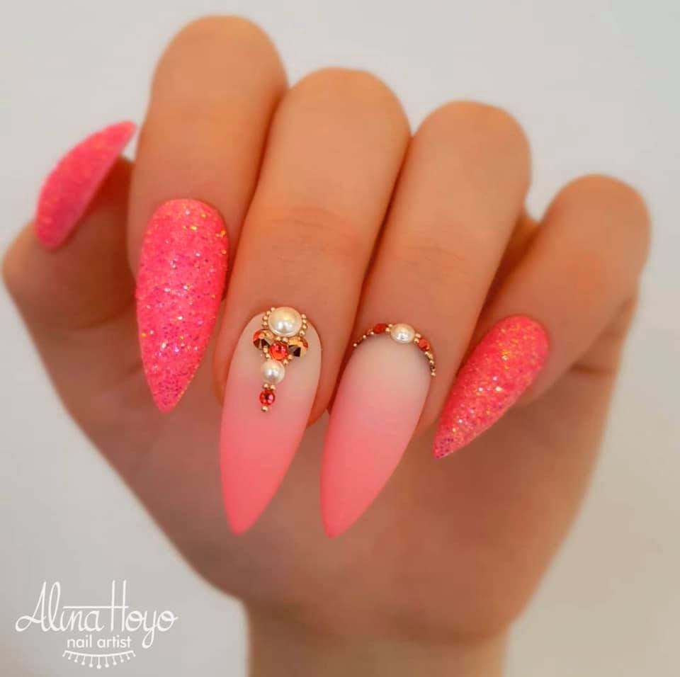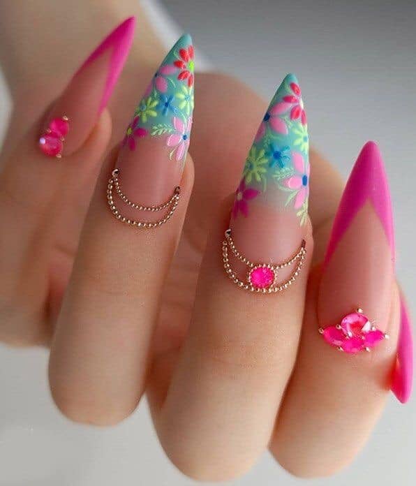 Create a gradient effect by placing rhinestones on the tips of your stiletto pointed nails. Start with a few rhinestones at the tip and gradually increase their density as you move towards the base of the nail. This design creates a dazzling and eye-catching look that elongates the appearance of your nails.
