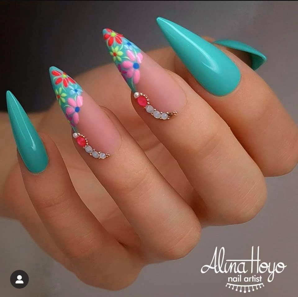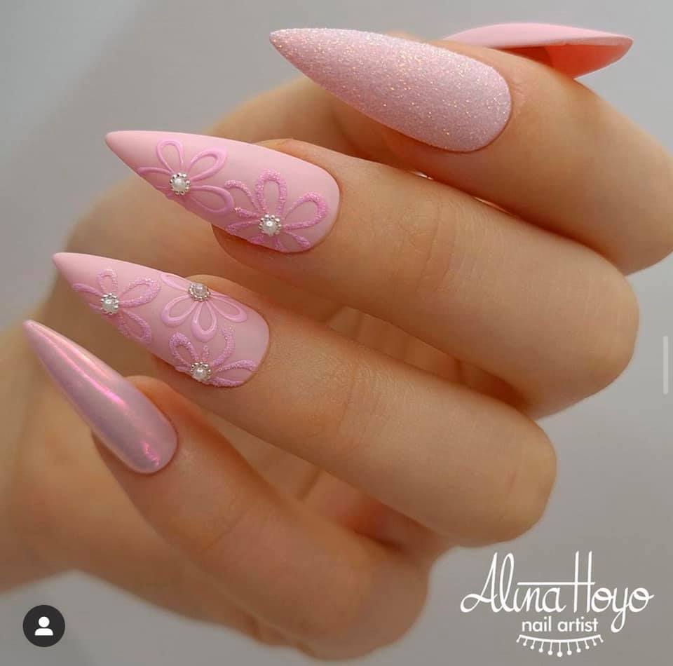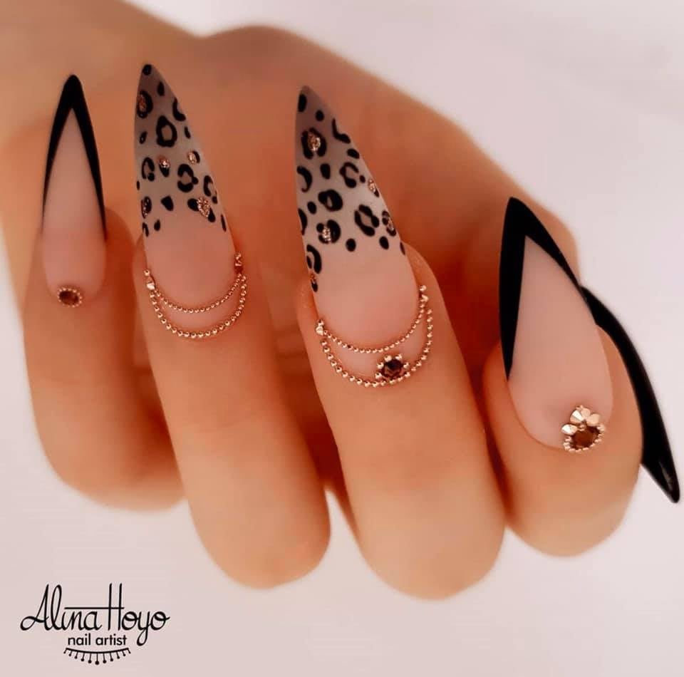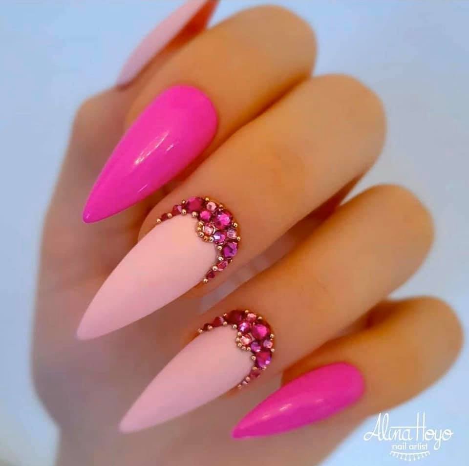 Get creative with different rhinestone patterns on your stiletto pointed nails. Experiment with geometric shapes, floral motifs, or intricate designs using a variety of rhinestone sizes and colors. You can create unique patterns on each nail or carry a consistent theme throughout your manicure. Let your imagination run wild and embrace the limitless possibilities.