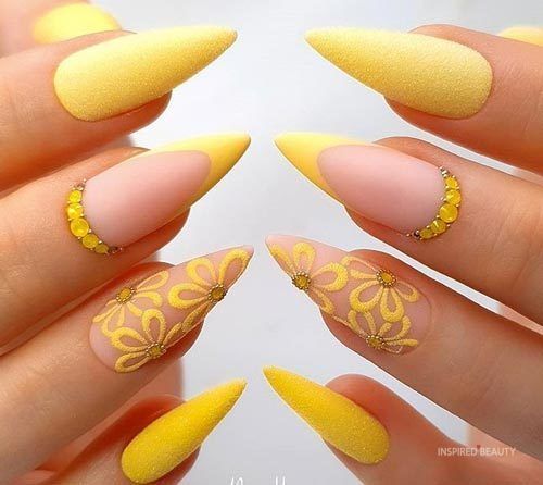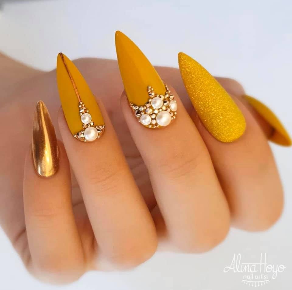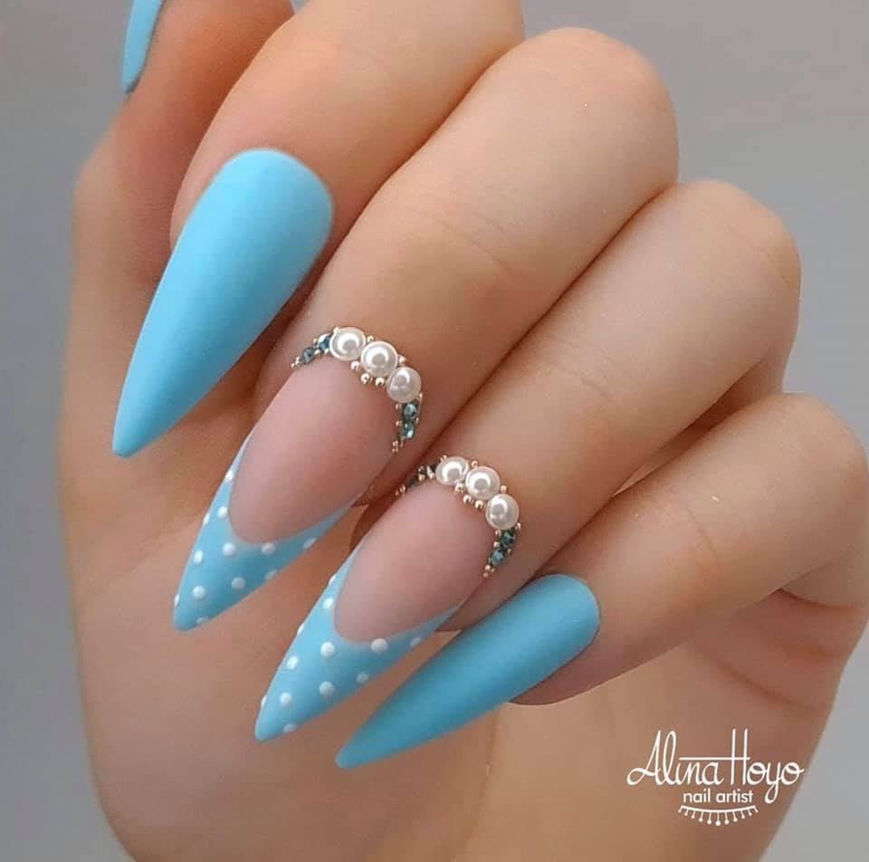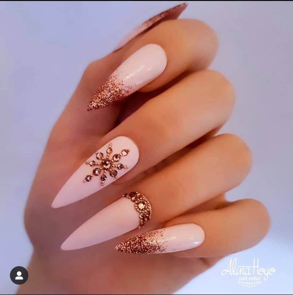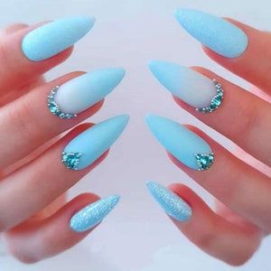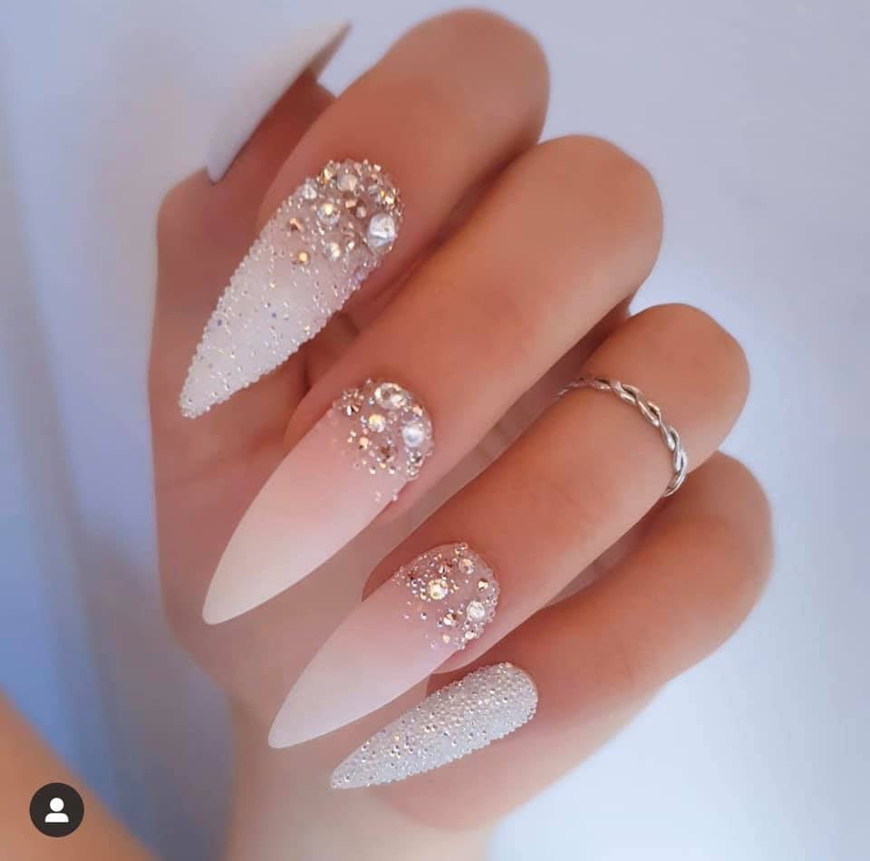 Embrace the full-on glamour with stiletto pointed nails entirely covered in rhinestones. Choose small or large rhinestones in a color that complements your base nail color. Apply them carefully using nail glue, ensuring full coverage and a stunning sparkle. This luxurious look is perfect for special occasions or when you want to feel like a true diva.