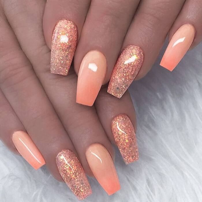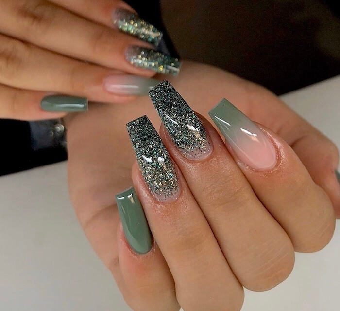 - Glitter ombre nails: You can add a little sparkle and gloss to your collection of manicure designs with this lovely glitter ombre. This is not only a stylish and cute way to dress up your fingertips, but it’s also simple to do at home.