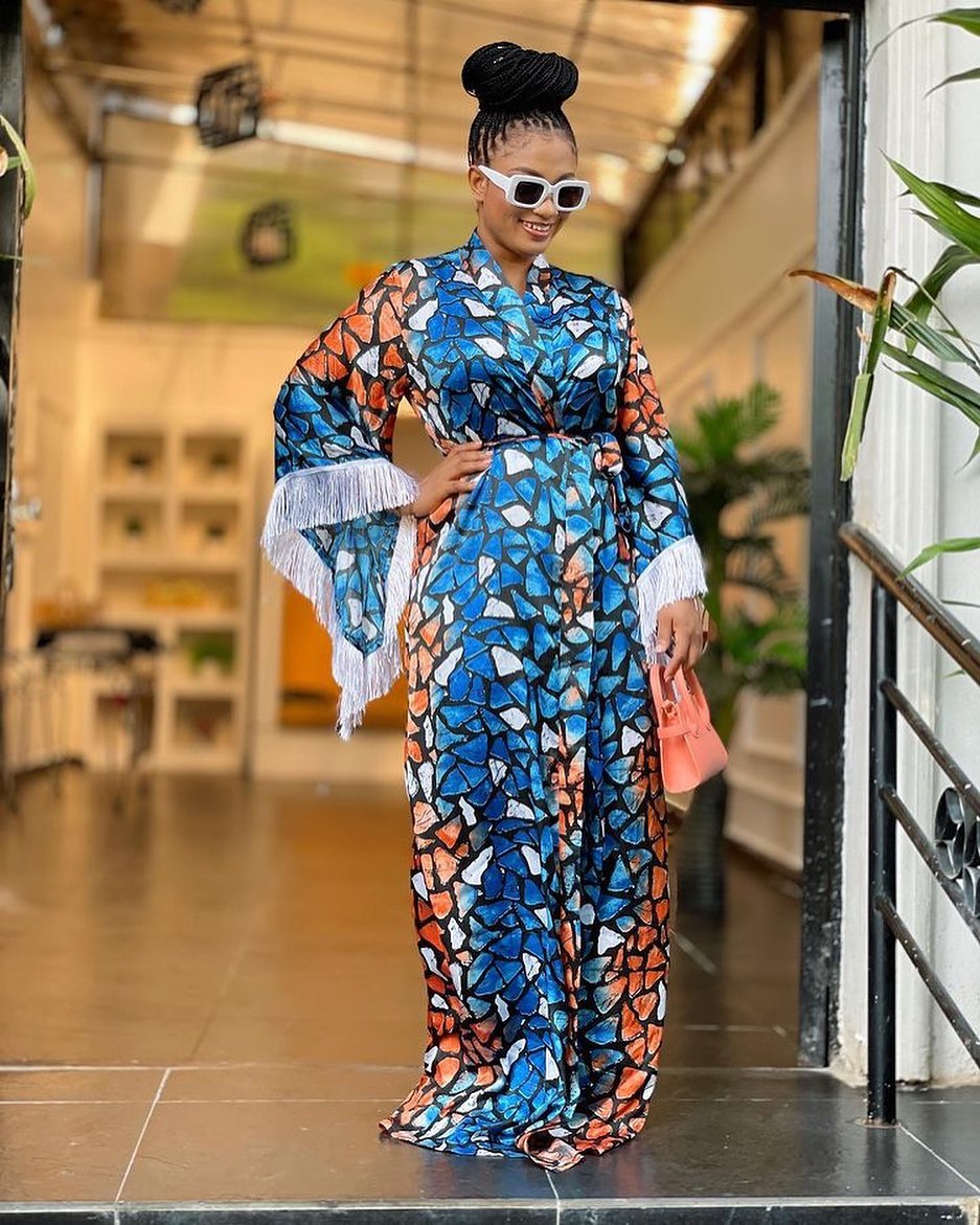 One of the orders of maxi dress material styles is the long- sleeved flowery dress for marriages. This maxi dress is designed with a knee- length dress.